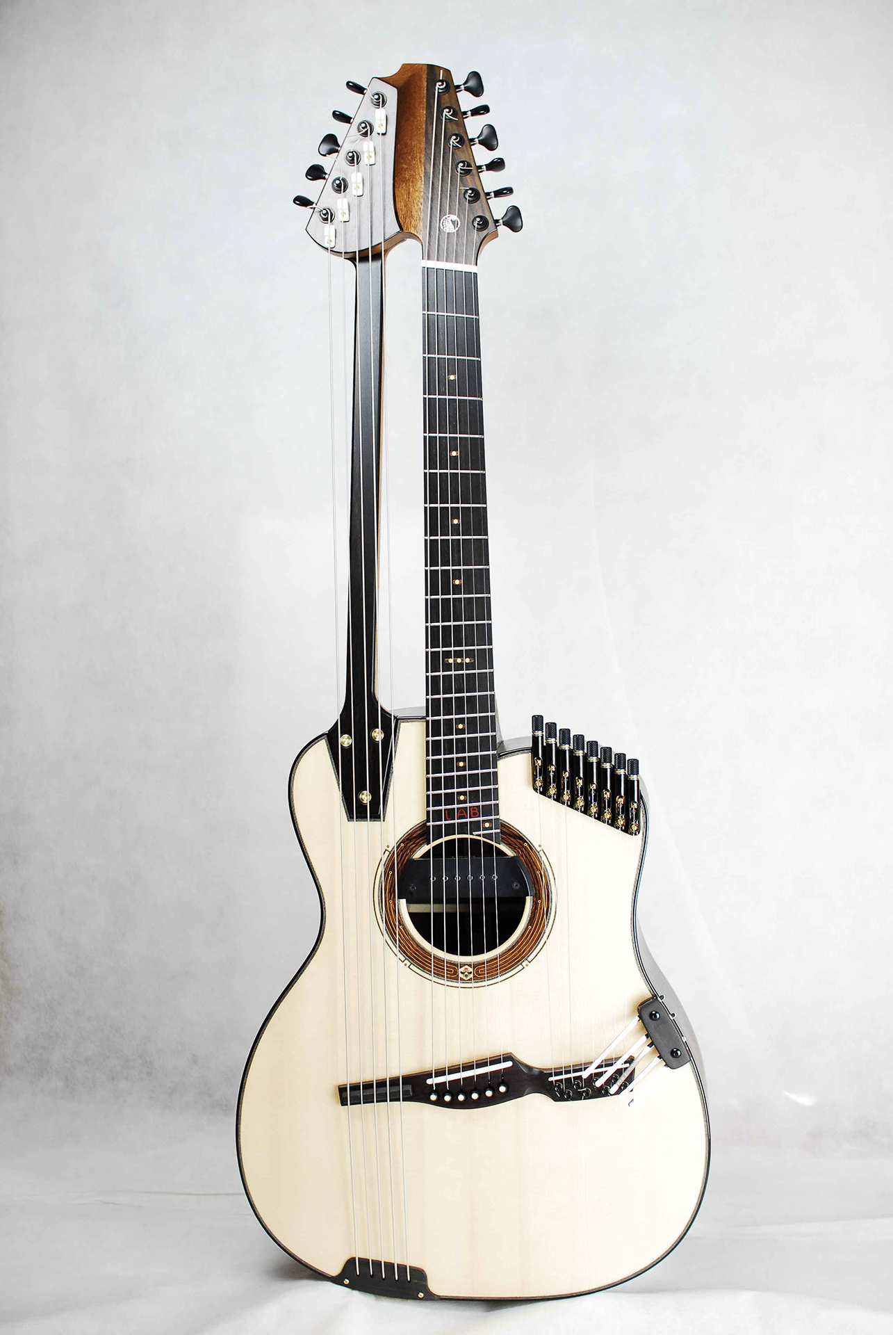 Il secondo è la chitarra costruita con e per Pino Forastiere. Ho ripensato il modello di chitarra arpa per adattarlo alle sue necessità personali: 5 bassi aggiunti, 8 corde acute su una cassa presa dal mio modello Grand Auditorium e leggermente modificata, con anche una piccola kalimba sulla tavola armonica. L’abbiamo chiamata Lab perché è stata prima di nascere un laboratorio di prove ed esperimenti, con la costruzione anche di un prototipo che ha portato poi alla versione definitiva.