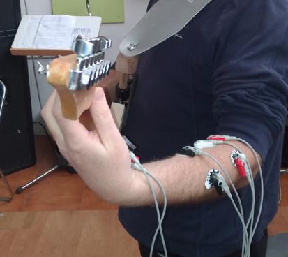 Si osserva che i valori di attività muscolare in questi gruppi muscolari variano cambiando l’assetto dello strumento; con un manico più orizzontale e un corpo più alto abbiamo un maggior coinvolgimento muscolare (figura sopra), con un’asse leggermente più verticalizzato (figura qui sotto) otteniamo dei tracciati con minor attività muscolare sul comparto del pollice.