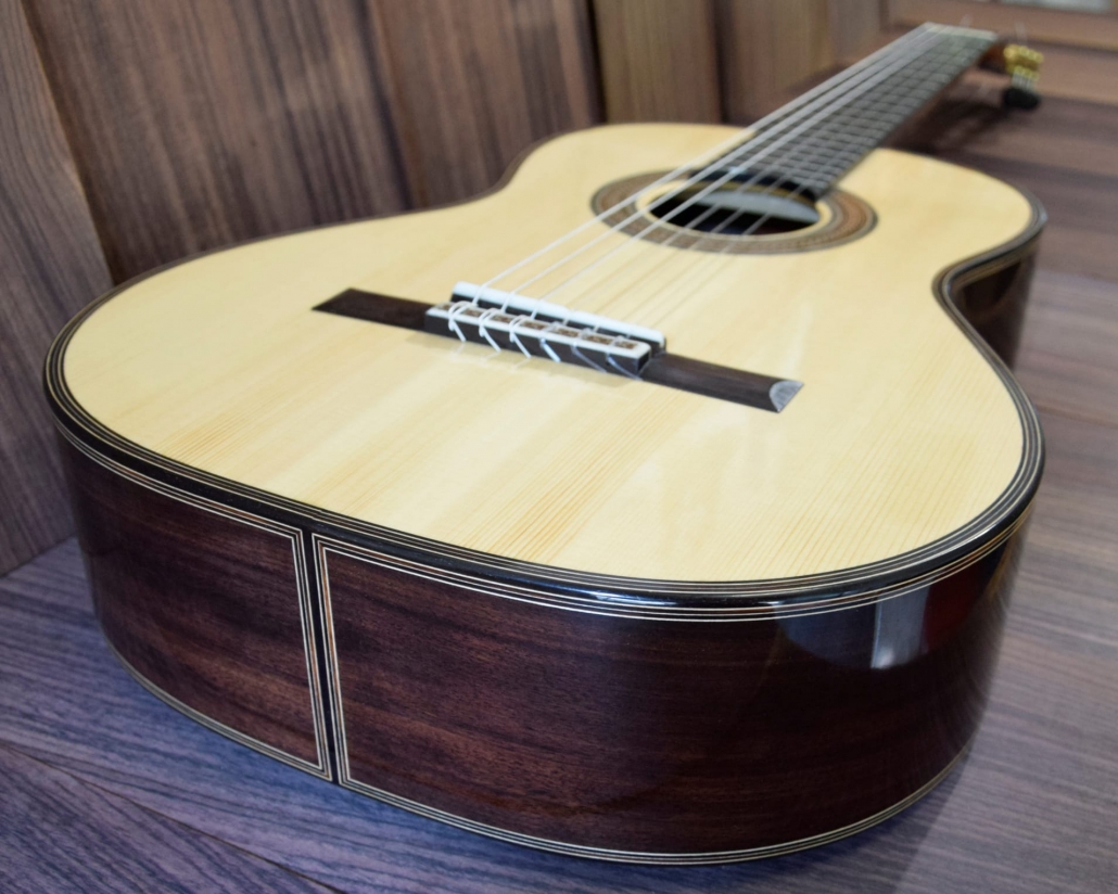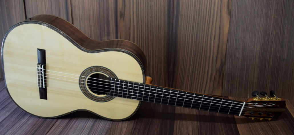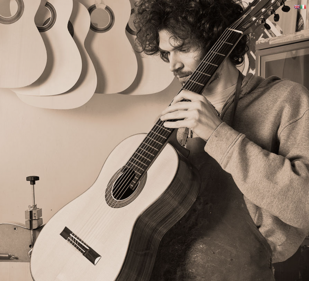Inseguo un suono che mantenga il fascino della chitarra tradizionale ricercando però nello stesso tempo l’efficienza propria degli strumenti di ultima generazione. Nelle mie chitarre mi sono ispirato all’antica liuteria spagnola, ma nel complesso il progetto è moderno e personale. Costruisco un solo modello in abete e palissandro indiano, solo su specifiche particolari utilizzo altri legni.