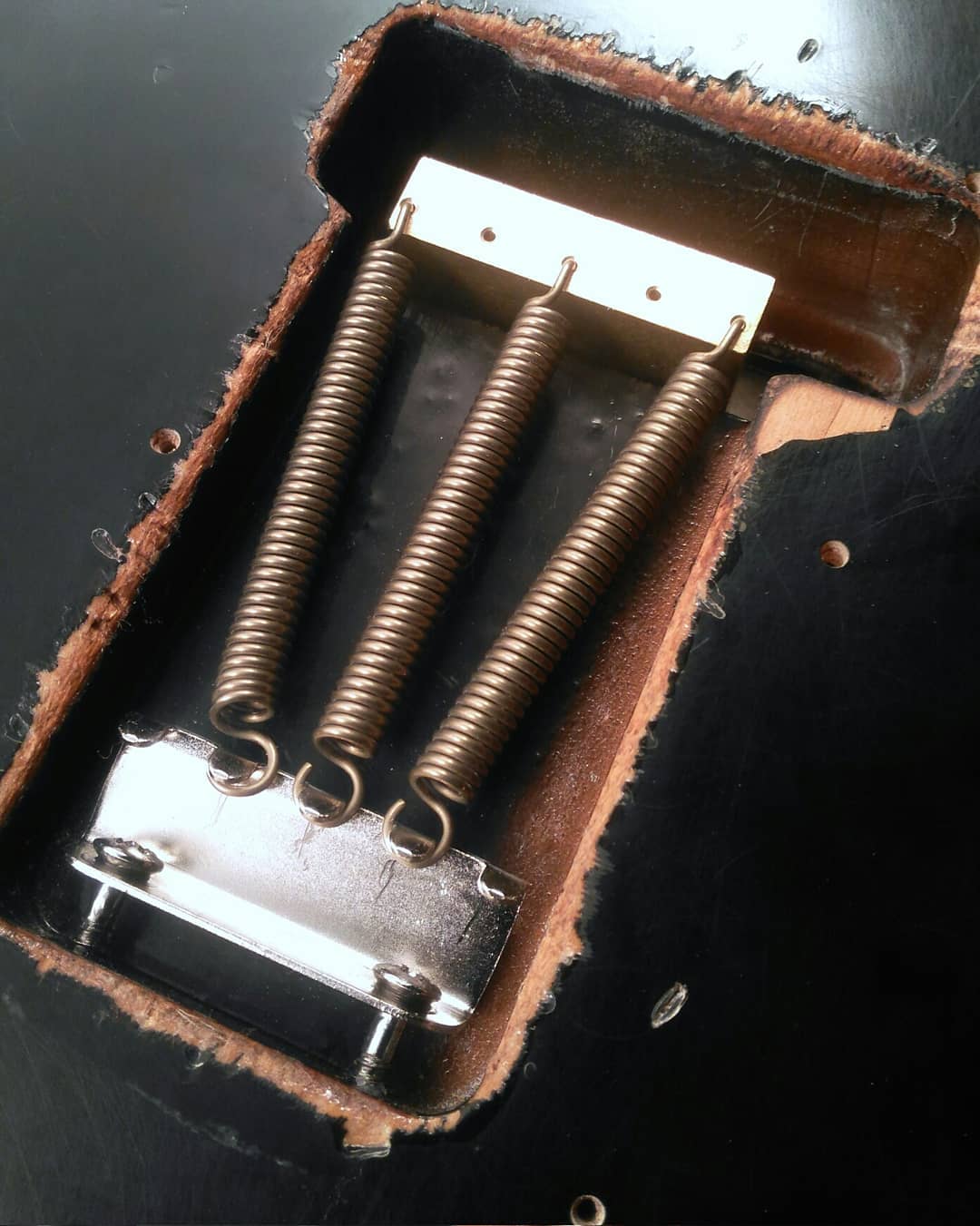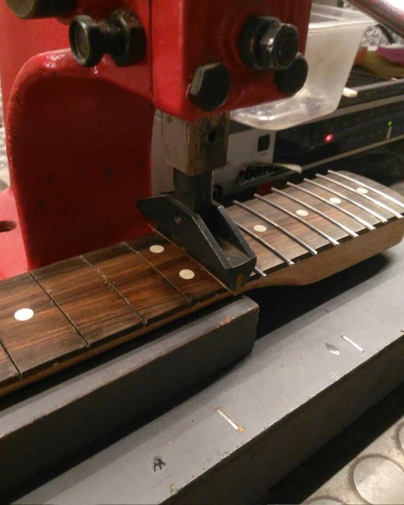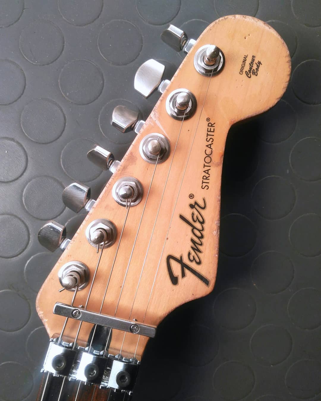Si trattava di un refret in acciaio, installazione dei segnatasti Luminlay, sverniciatura del manico e reliccatura di livello medio, ovvero con le classiche scrostature di vernice ai quattro angoli.