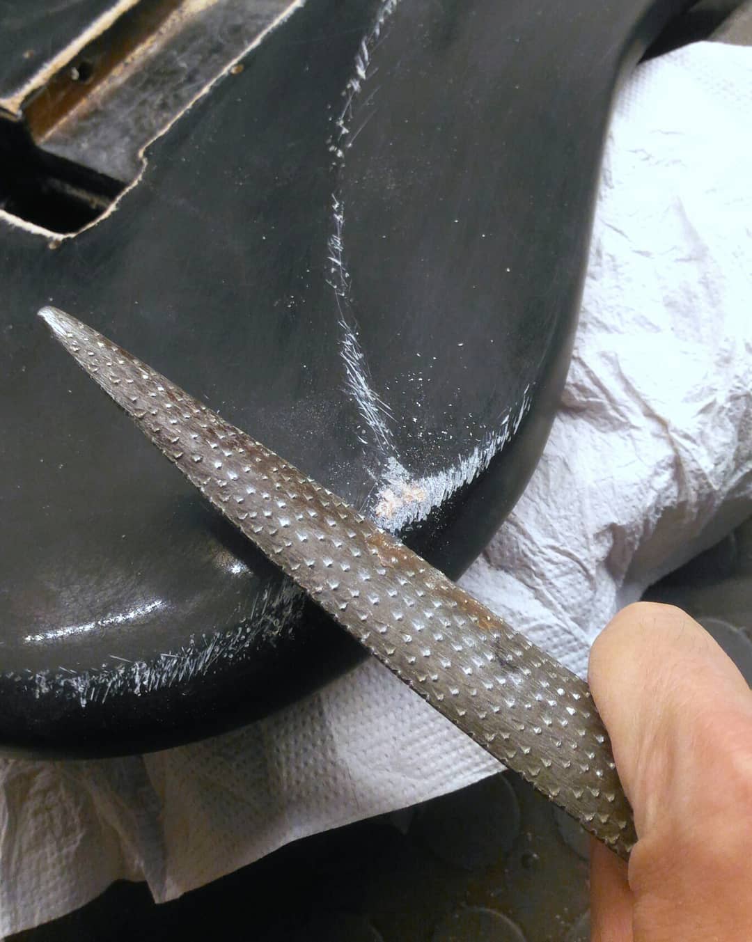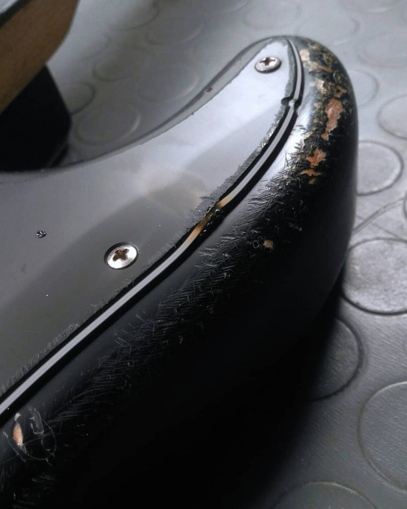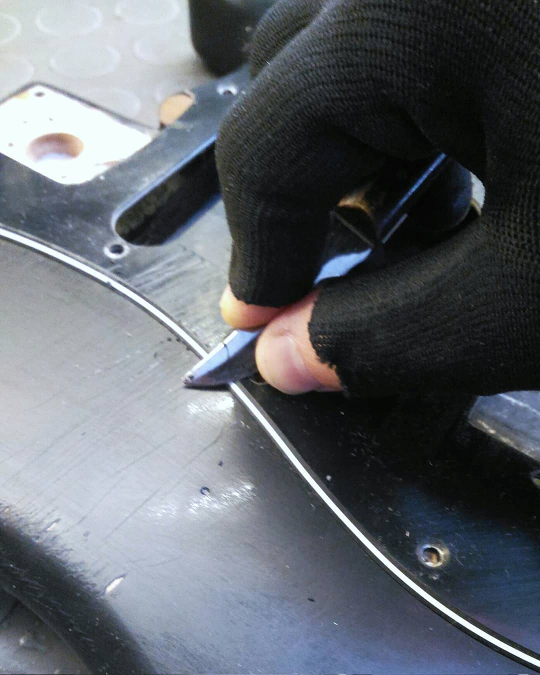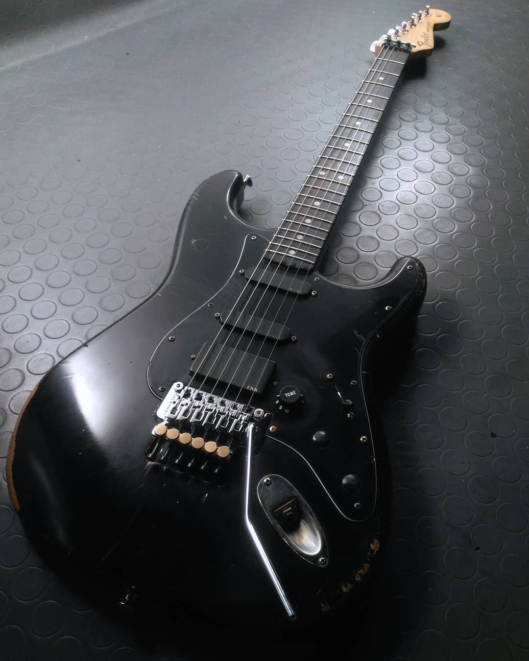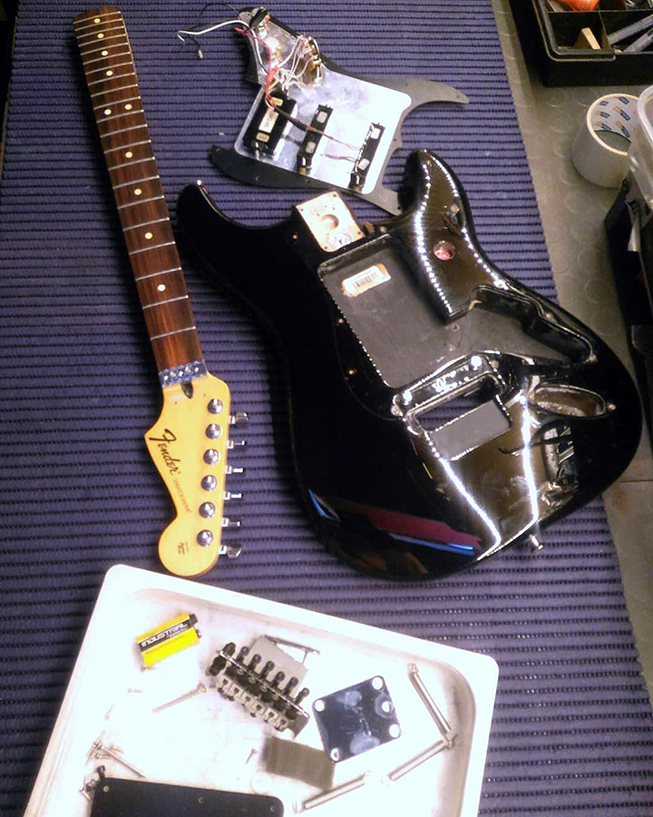La Stratocaster nera di Marco Sfogli è stato un lavoro tanto faticoso quanto divertente per il sottoscritto (visita il mio sito GuitarMigi.it).