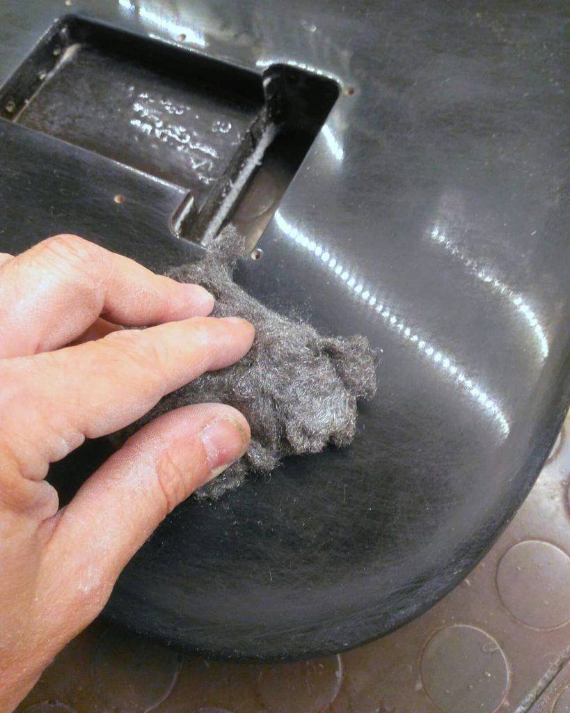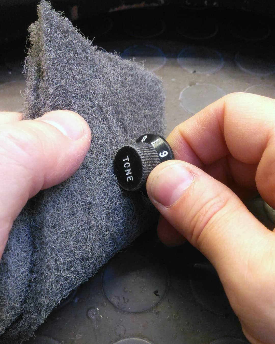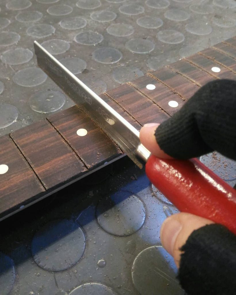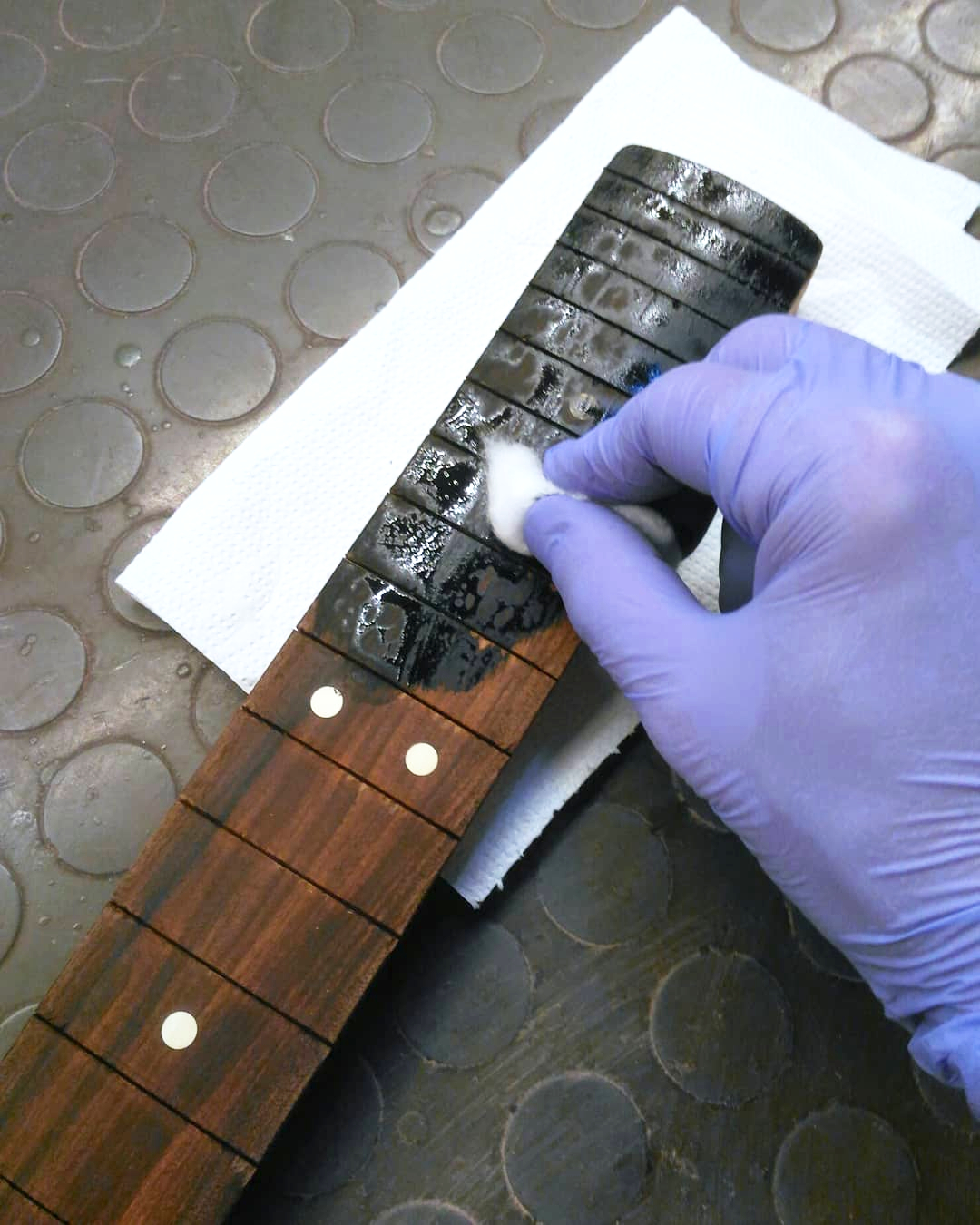 Per prima cosa mi sono assicurato che la tastiera fosse dritta come un fuso, senza avvallamenti o irregolarità, e dopo una leggera livellata precauzionale ho scurito il manico con quella procedura che ho battezzato come “ebanizzazione“, che ha una funzione meramente estetica.