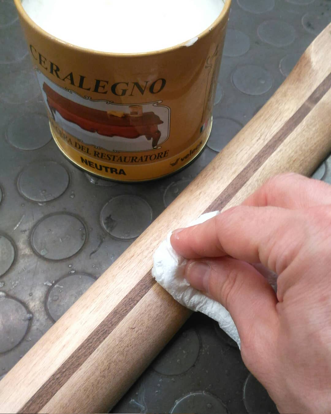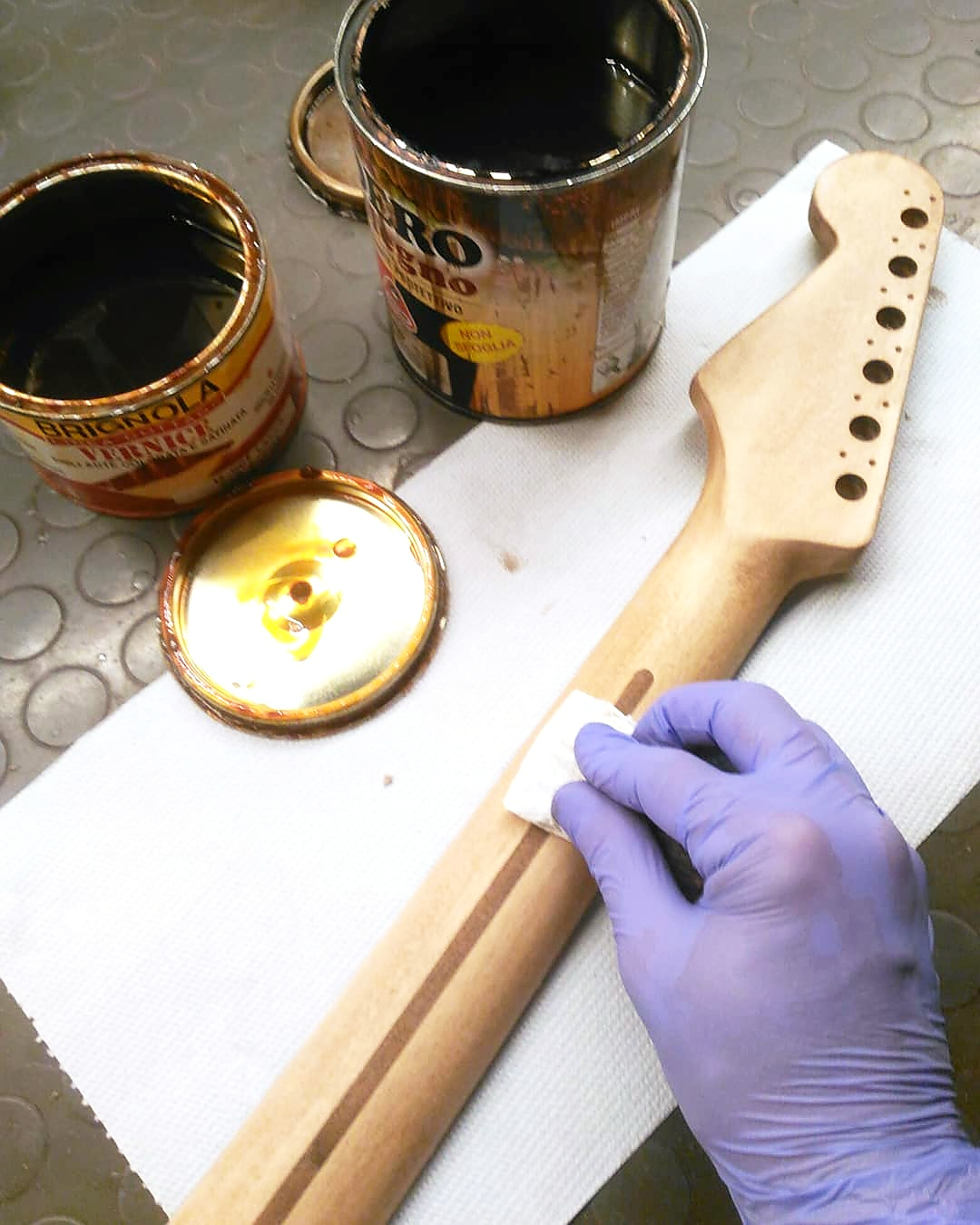 Dopo una passata di olio sulla tastiera e un paio di impregnante color larice e di cera d’api sul retro, ho lasciato assorbire durante il resto del lavoro sul body.