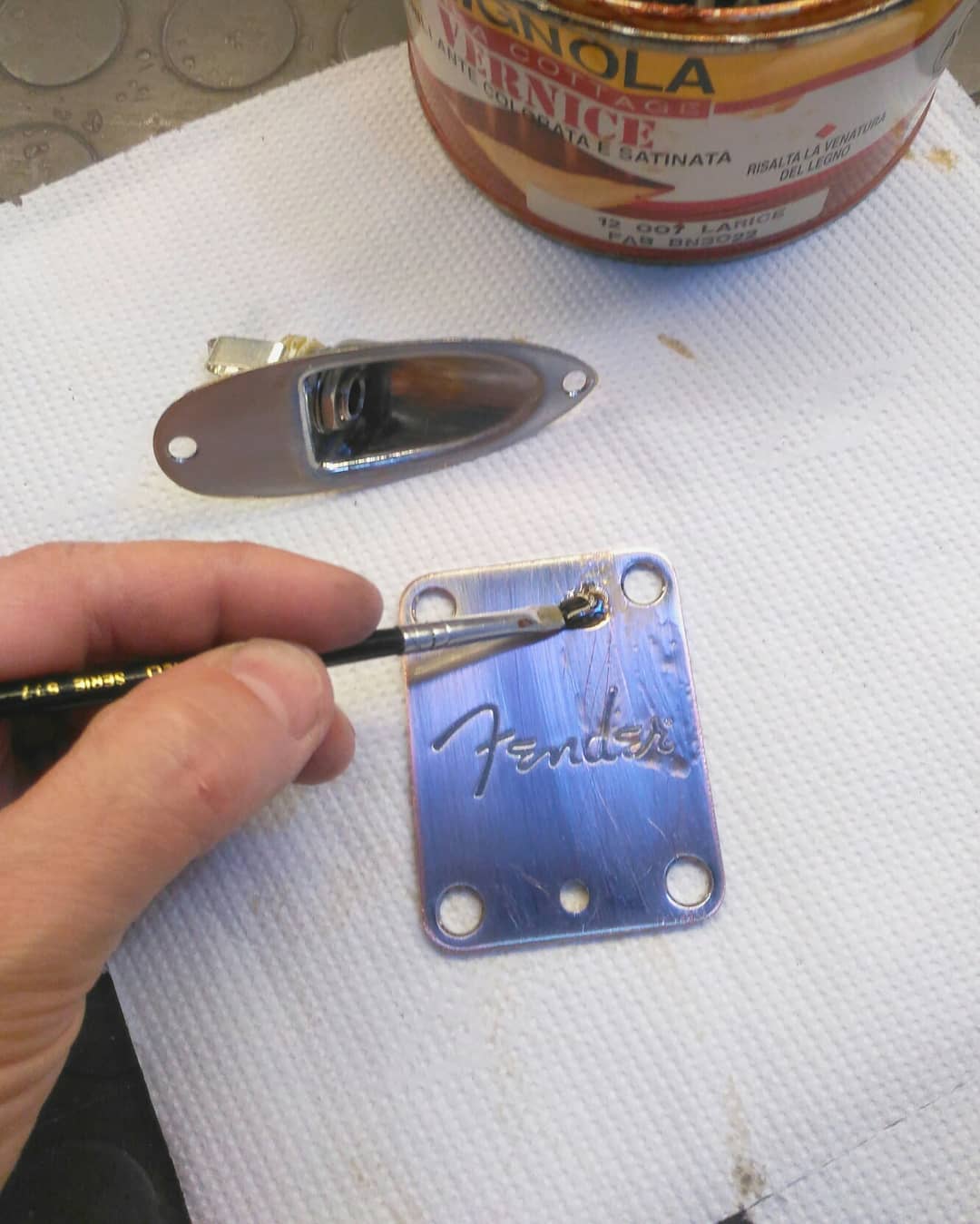 Anche l’hardware è stato sottoposto a trattamento di anticatura, ad eccezione del ponte, come richiestomi dallo stesso Marco.