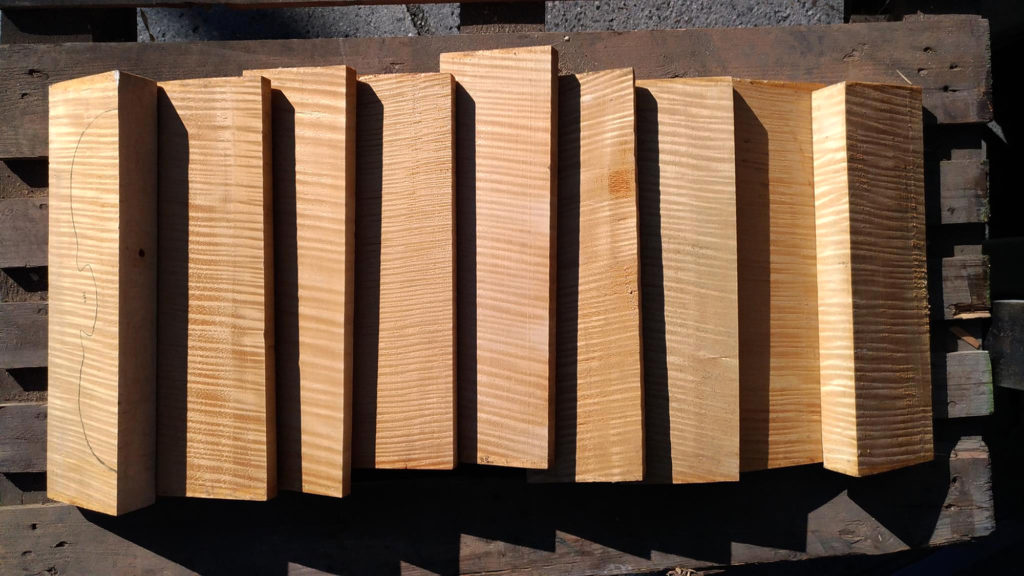 L’acero europeo – con le sue caratteristiche fiammature – viene utilizzato per fasce e fondo di archi e chitarre, ma per i top di chitarre elettriche e certi manici Rivolta compra acero americano. Oggi è difficilissimo da trovare il bird’s eye maple o acero occhiolinato, se non in quantità limitatissima o come pretagliato dagli USA.