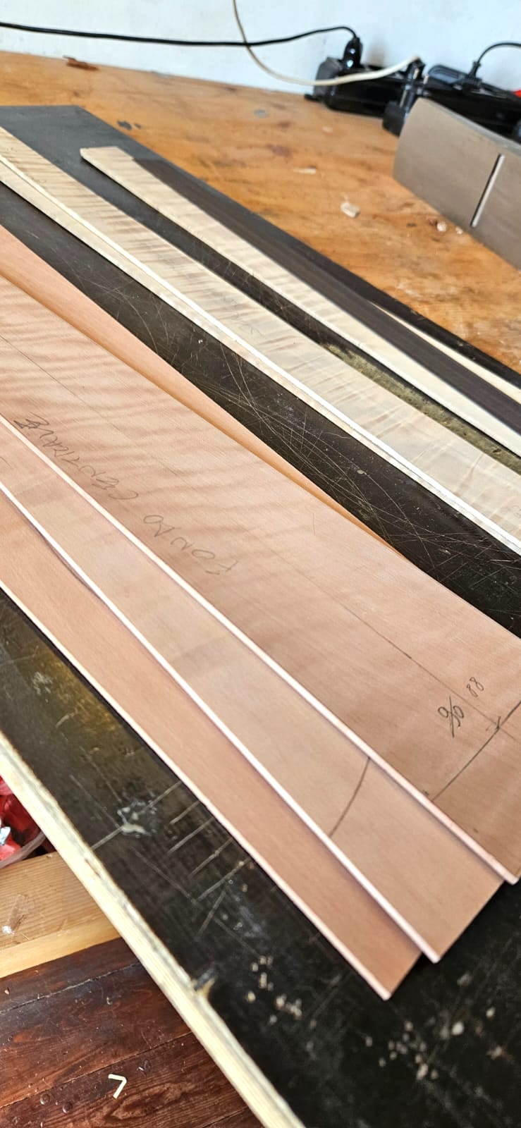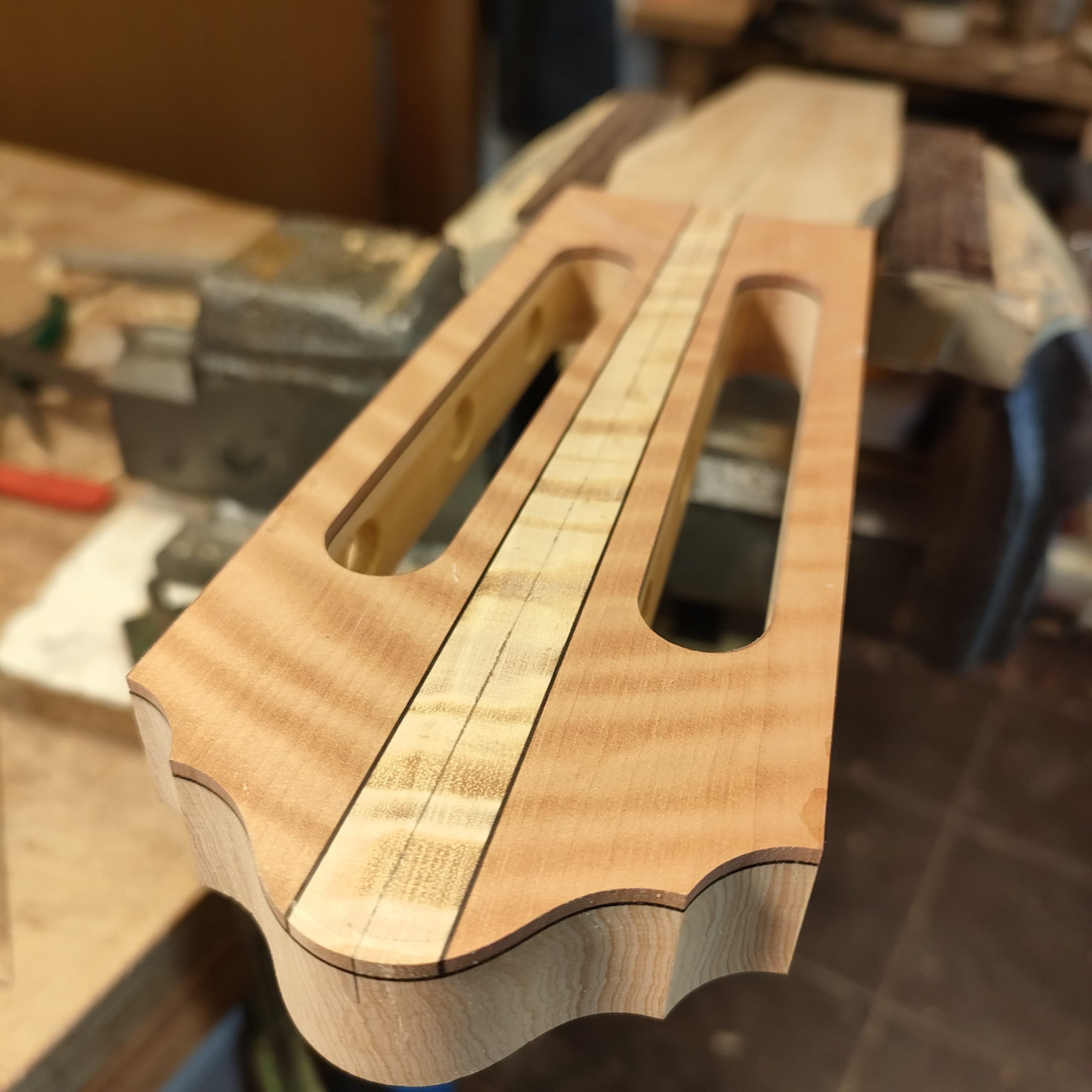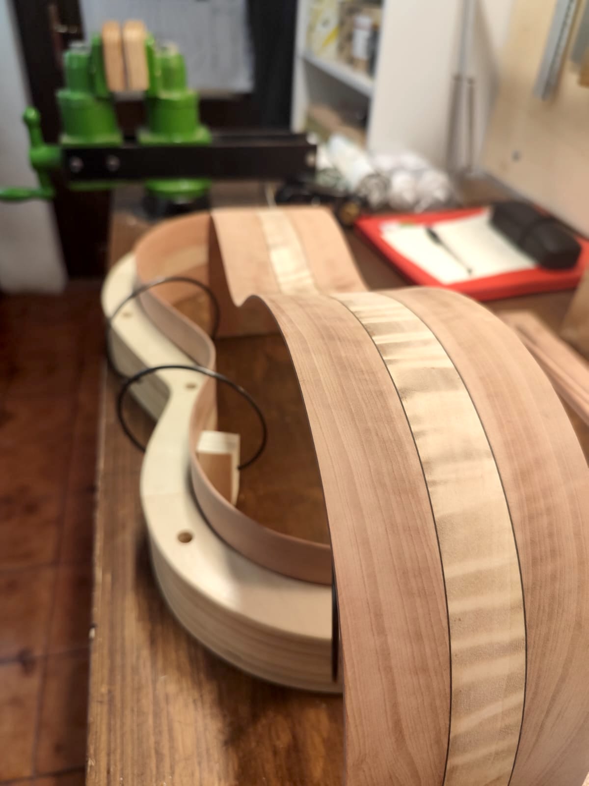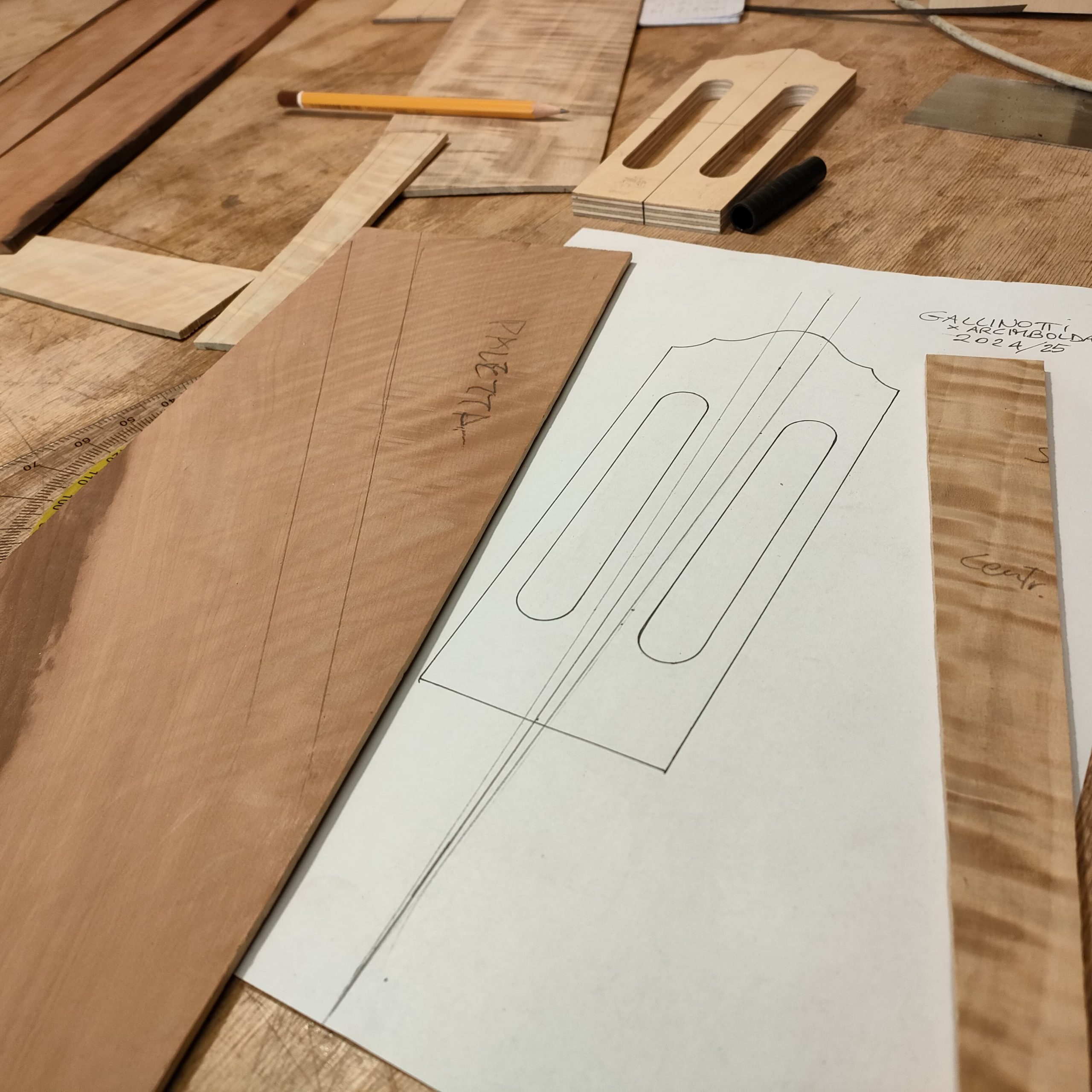 Nel settembre 2024, Enrico Bottelli e Lorenzo Lippi hanno scelto presso Rivolta dei magnifici pezzi di pioppo, pero e noce – legni selezionati per le doghe degli strumenti a guscio – tutti con splendida marezzatura. Dall’osservazione delle caratteristiche estetiche dei legni è nata l’idea di costruire uno strumento con fasce e fondo di due essenze (pero e pioppo), richiamando l’antica tecnica delle doghe.