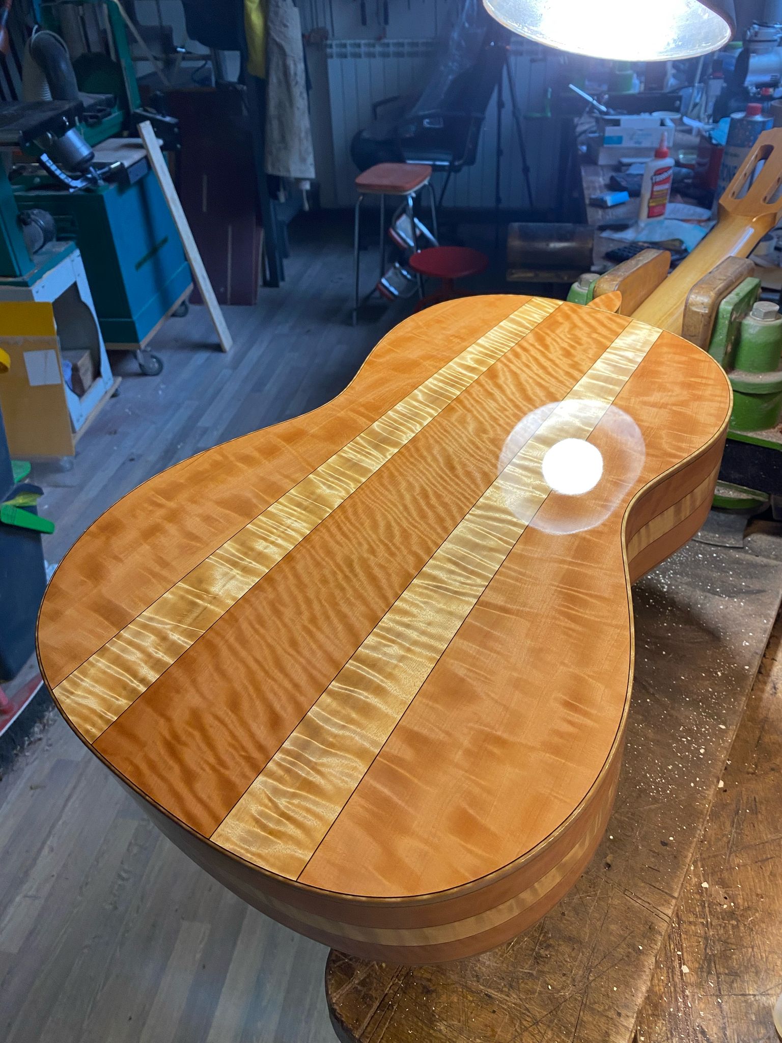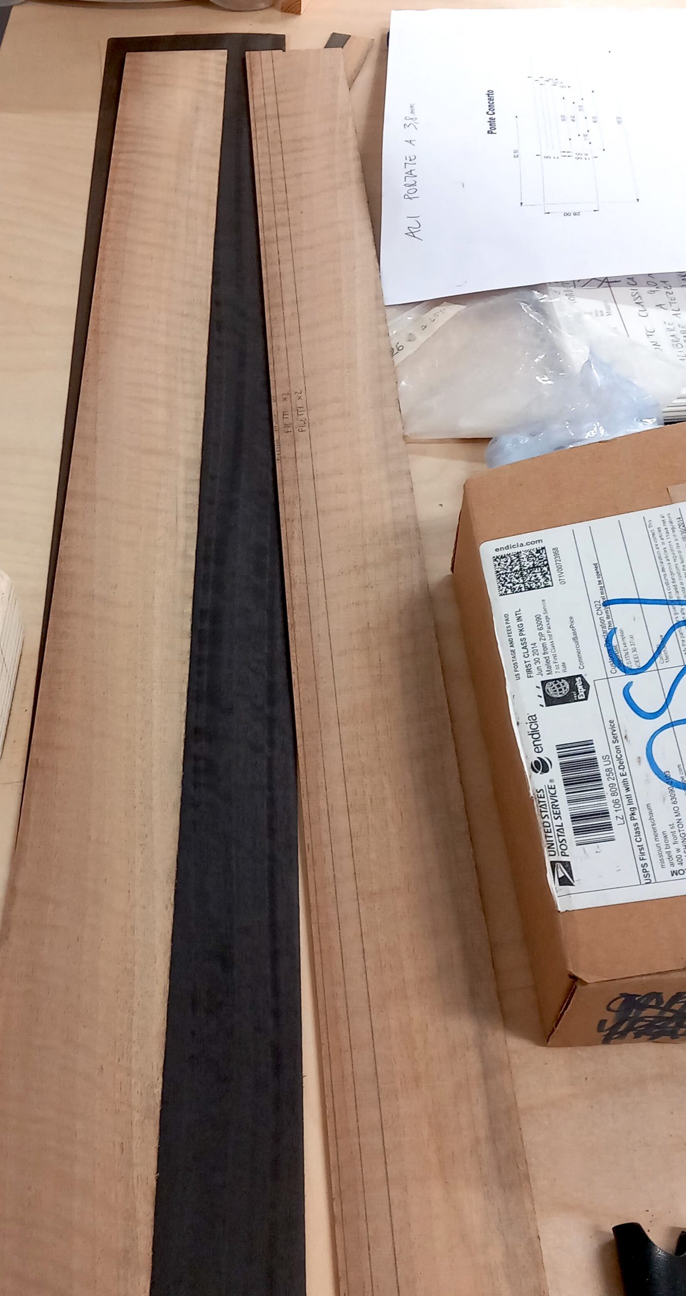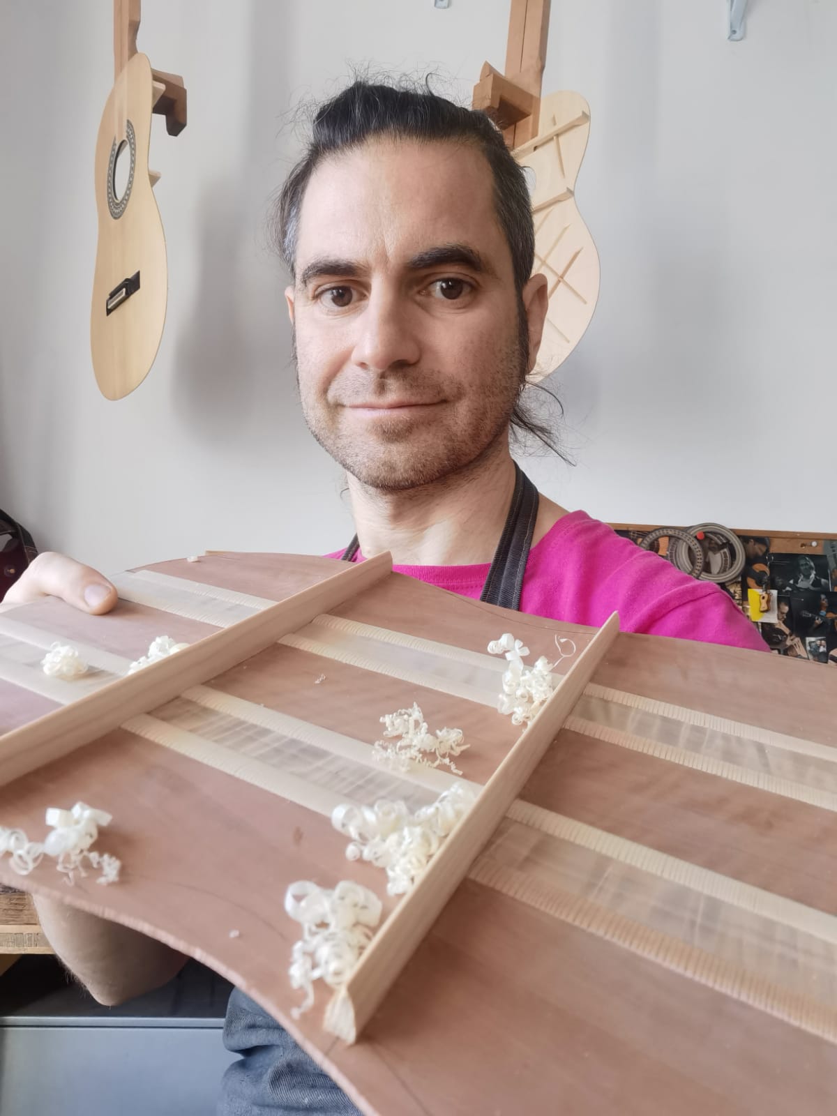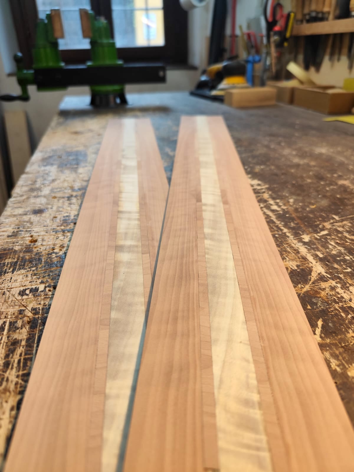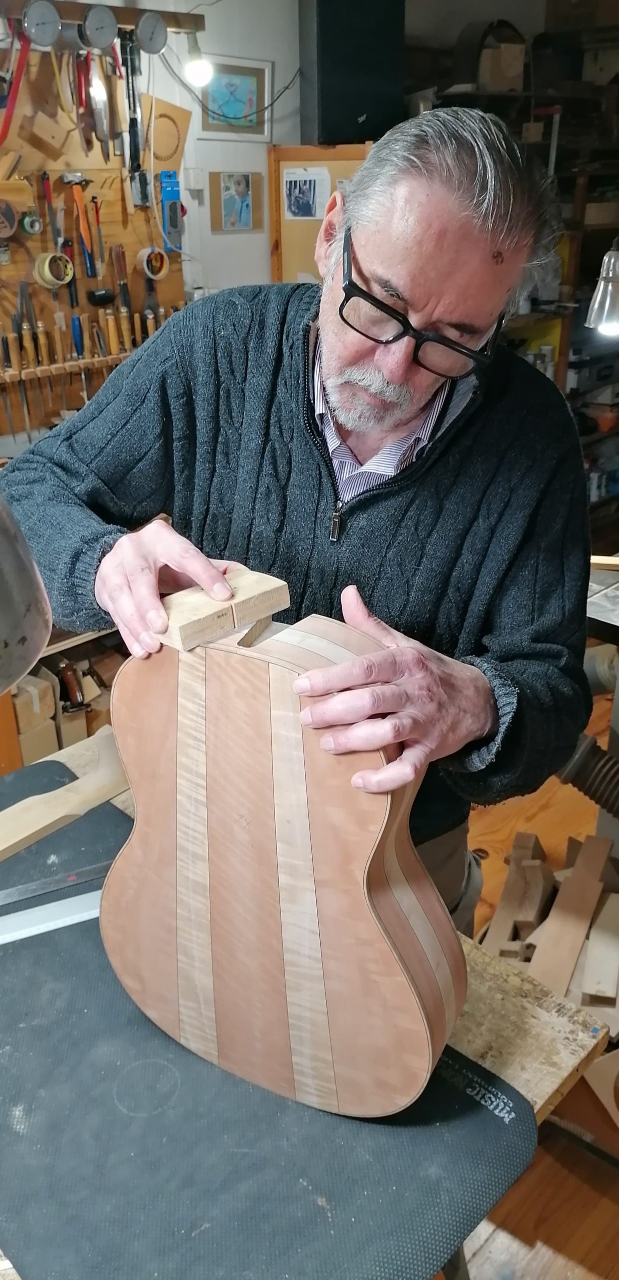 Nel settembre 2024, Enrico Bottelli e Lorenzo Lippi hanno scelto presso Rivolta dei magnifici pezzi di pioppo, pero e noce – legni selezionati per le doghe degli strumenti a guscio – tutti con splendida marezzatura. Dall’osservazione delle caratteristiche estetiche dei legni è nata l’idea di costruire uno strumento con fasce e fondo di due essenze (pero e pioppo), richiamando l’antica tecnica delle doghe.