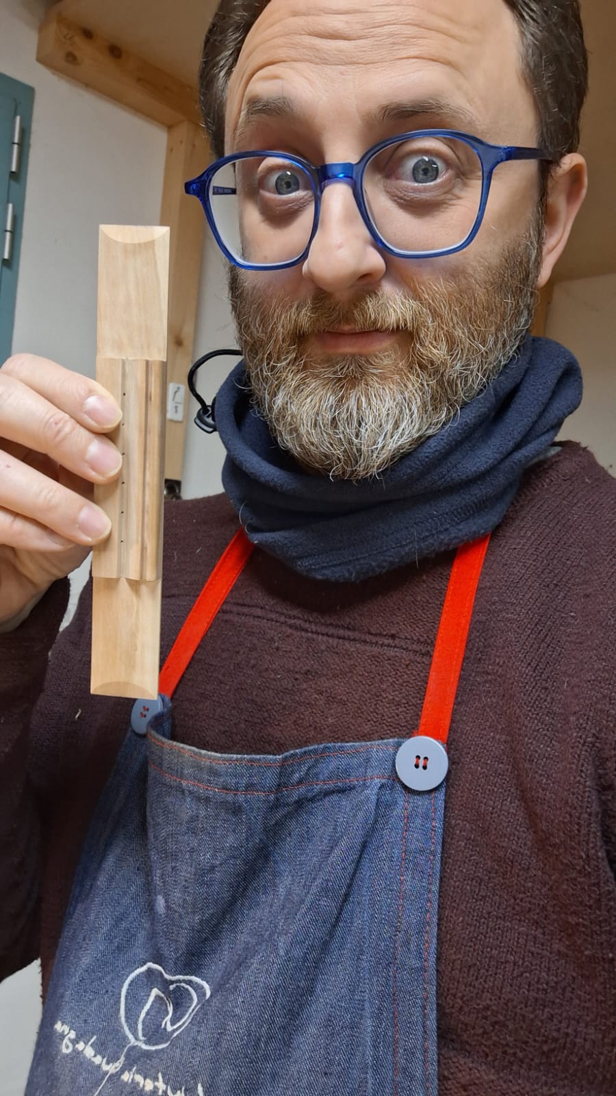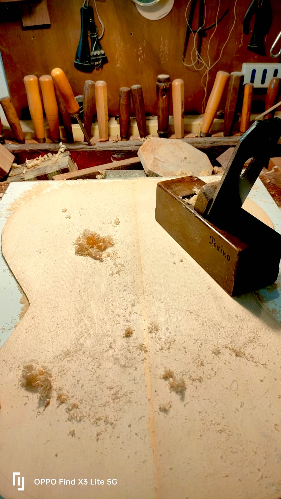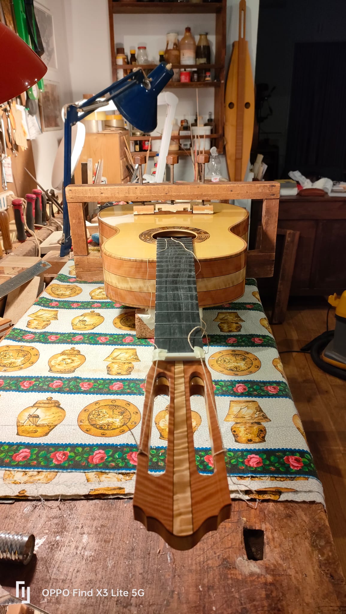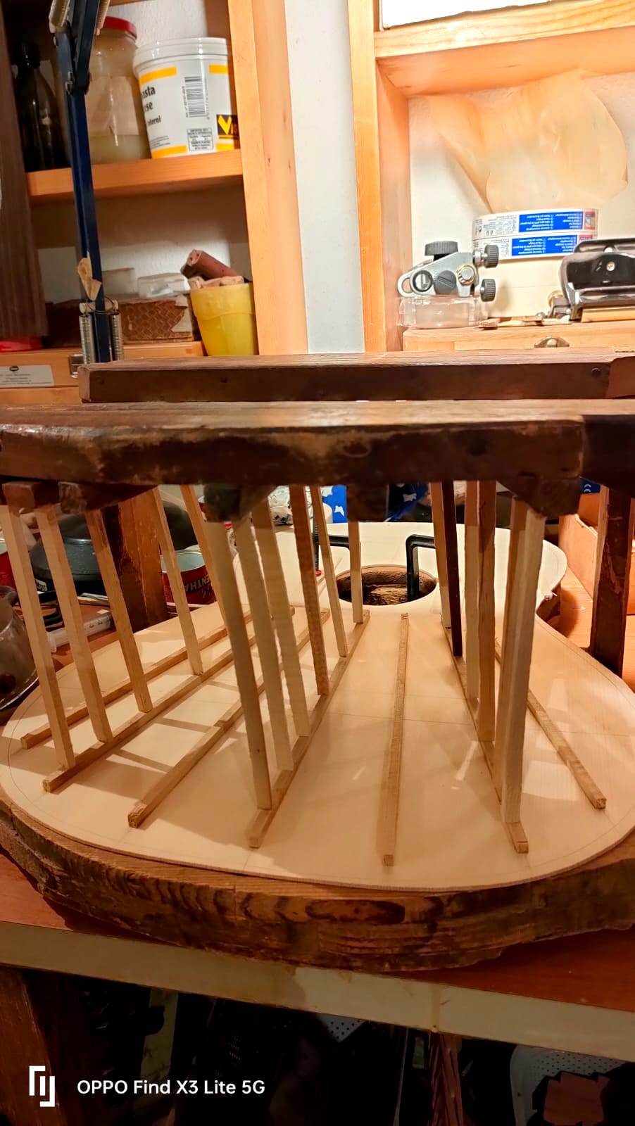 Nel settembre 2024, Enrico Bottelli e Lorenzo Lippi hanno scelto presso Rivolta dei magnifici pezzi di pioppo, pero e noce – legni selezionati per le doghe degli strumenti a guscio – tutti con splendida marezzatura. Dall’osservazione delle caratteristiche estetiche dei legni è nata l’idea di costruire uno strumento con fasce e fondo di due essenze (pero e pioppo), richiamando l’antica tecnica delle doghe.