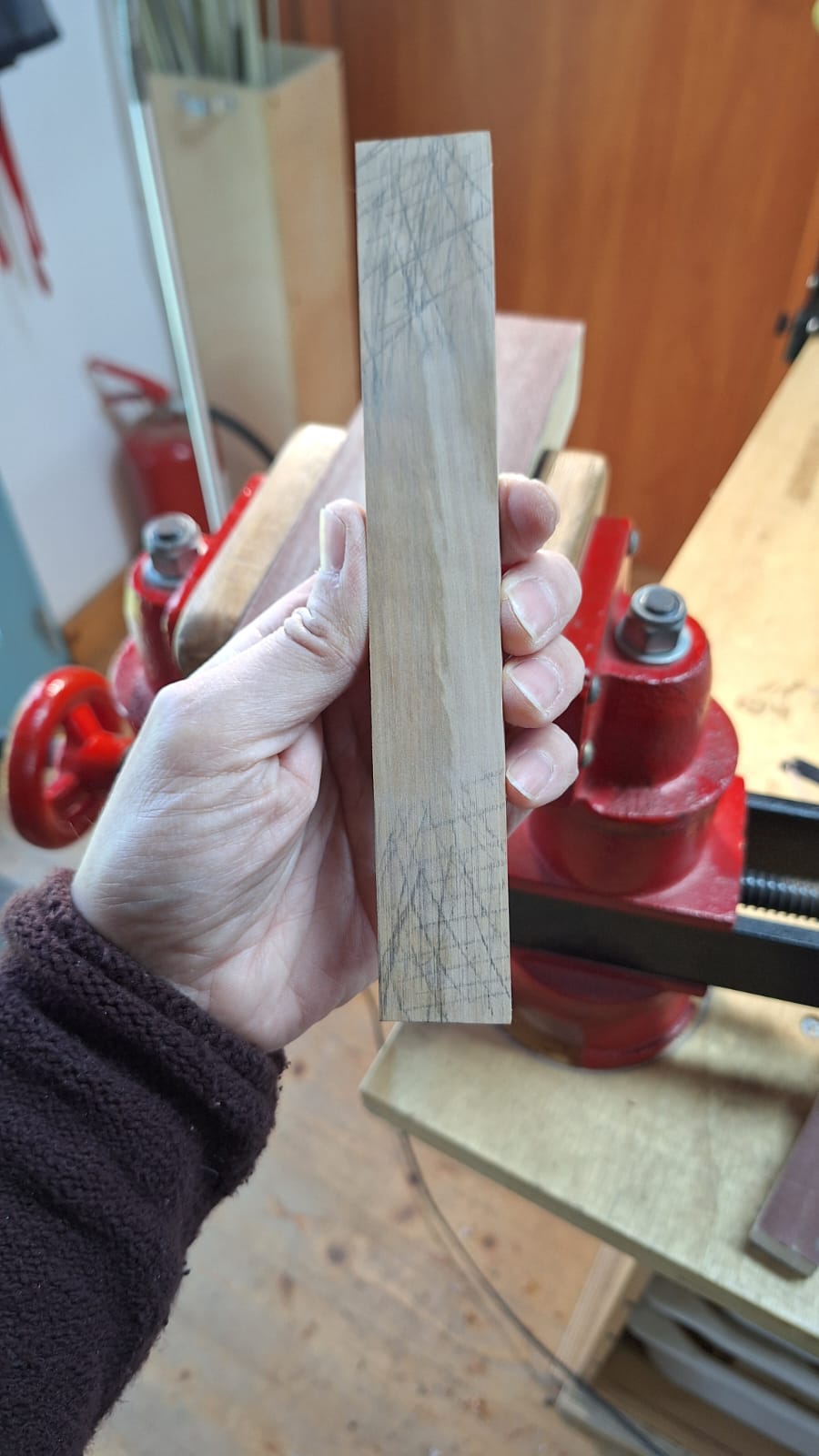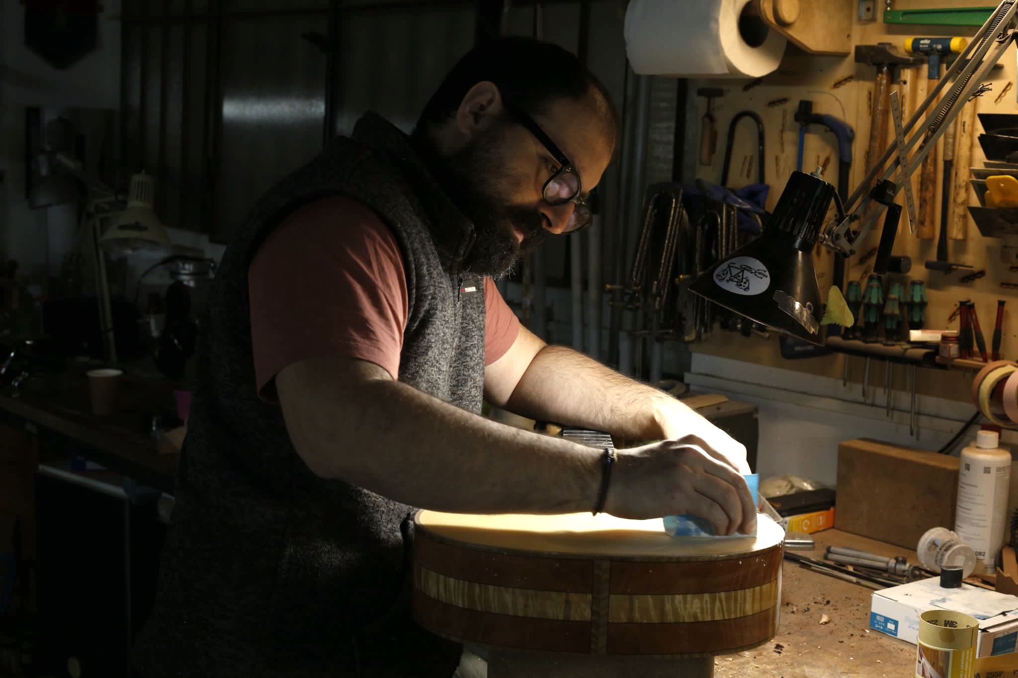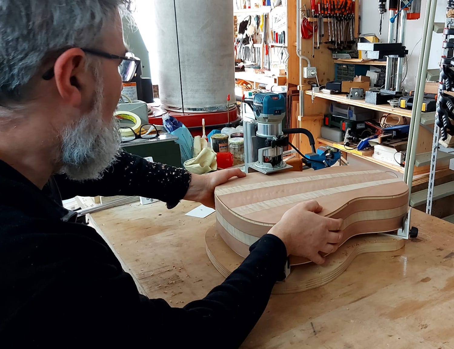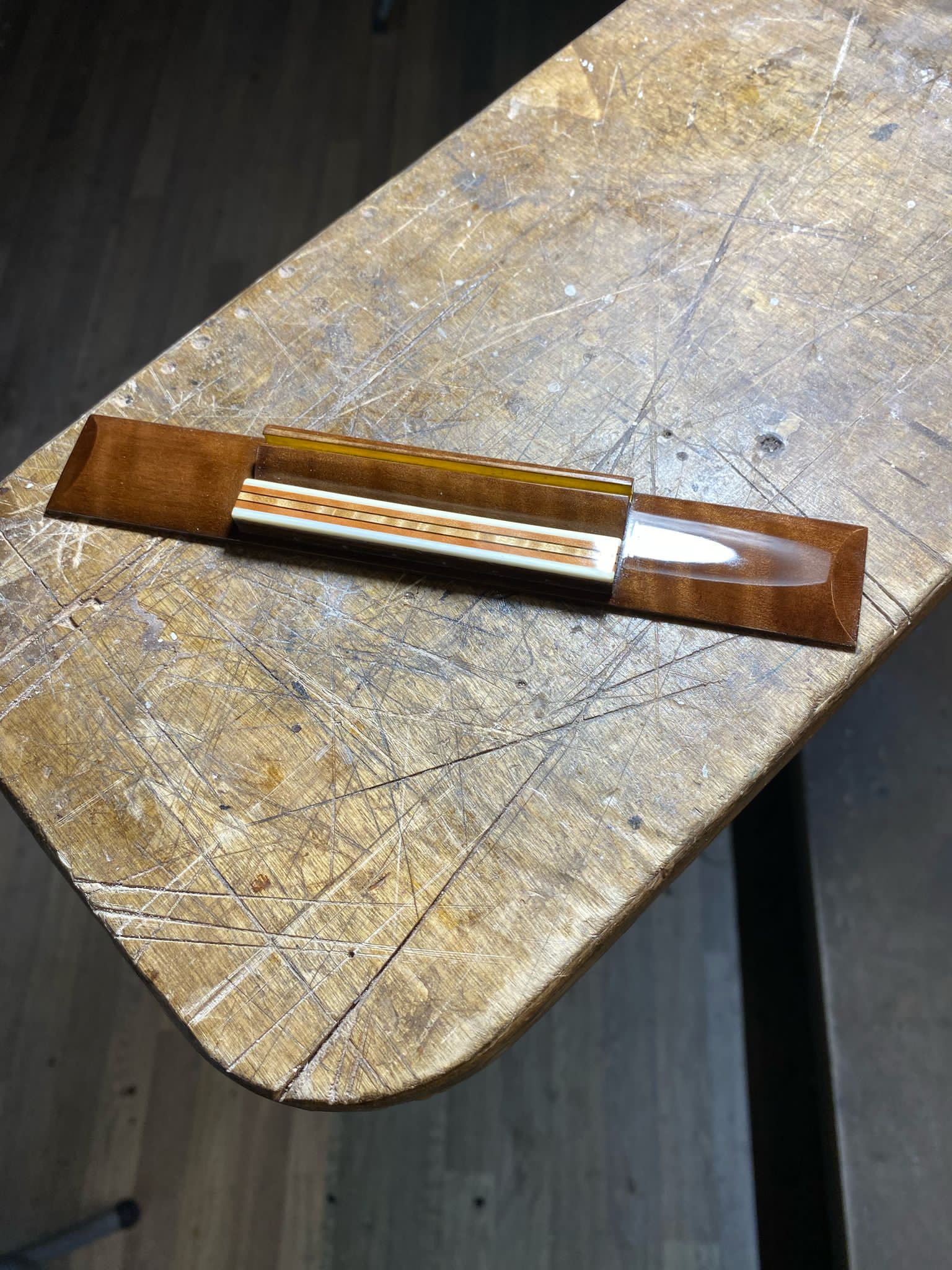 Nel settembre 2024, Enrico Bottelli e Lorenzo Lippi hanno scelto presso Rivolta dei magnifici pezzi di pioppo, pero e noce – legni selezionati per le doghe degli strumenti a guscio – tutti con splendida marezzatura. Dall’osservazione delle caratteristiche estetiche dei legni è nata l’idea di costruire uno strumento con fasce e fondo di due essenze (pero e pioppo), richiamando l’antica tecnica delle doghe.