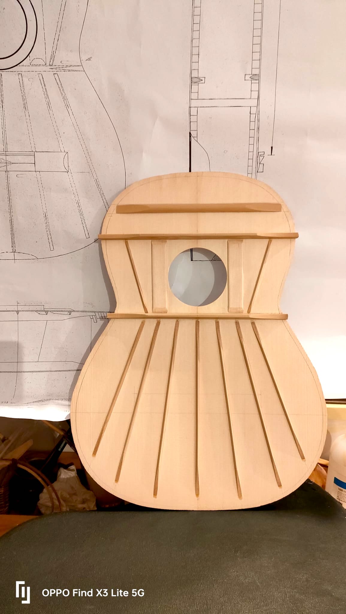 - Tavola armonica: Abete della Val di Fiemme, venatura stretta e uniforme, taglio di quarto, spessori circa 2,5 mm, bombatura al ponticello 3 mm, diametro buca 87 mm