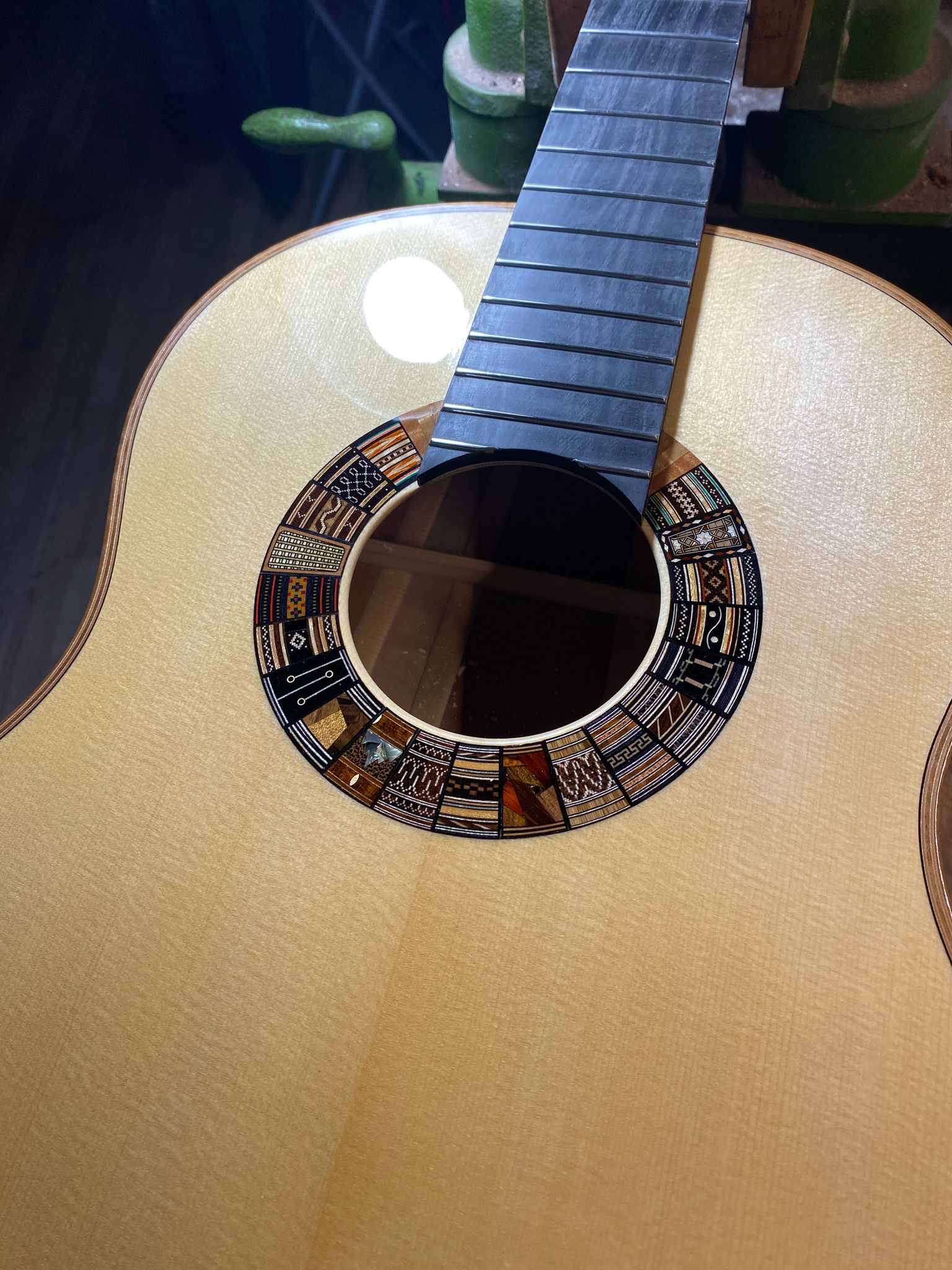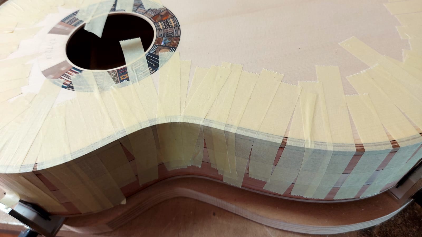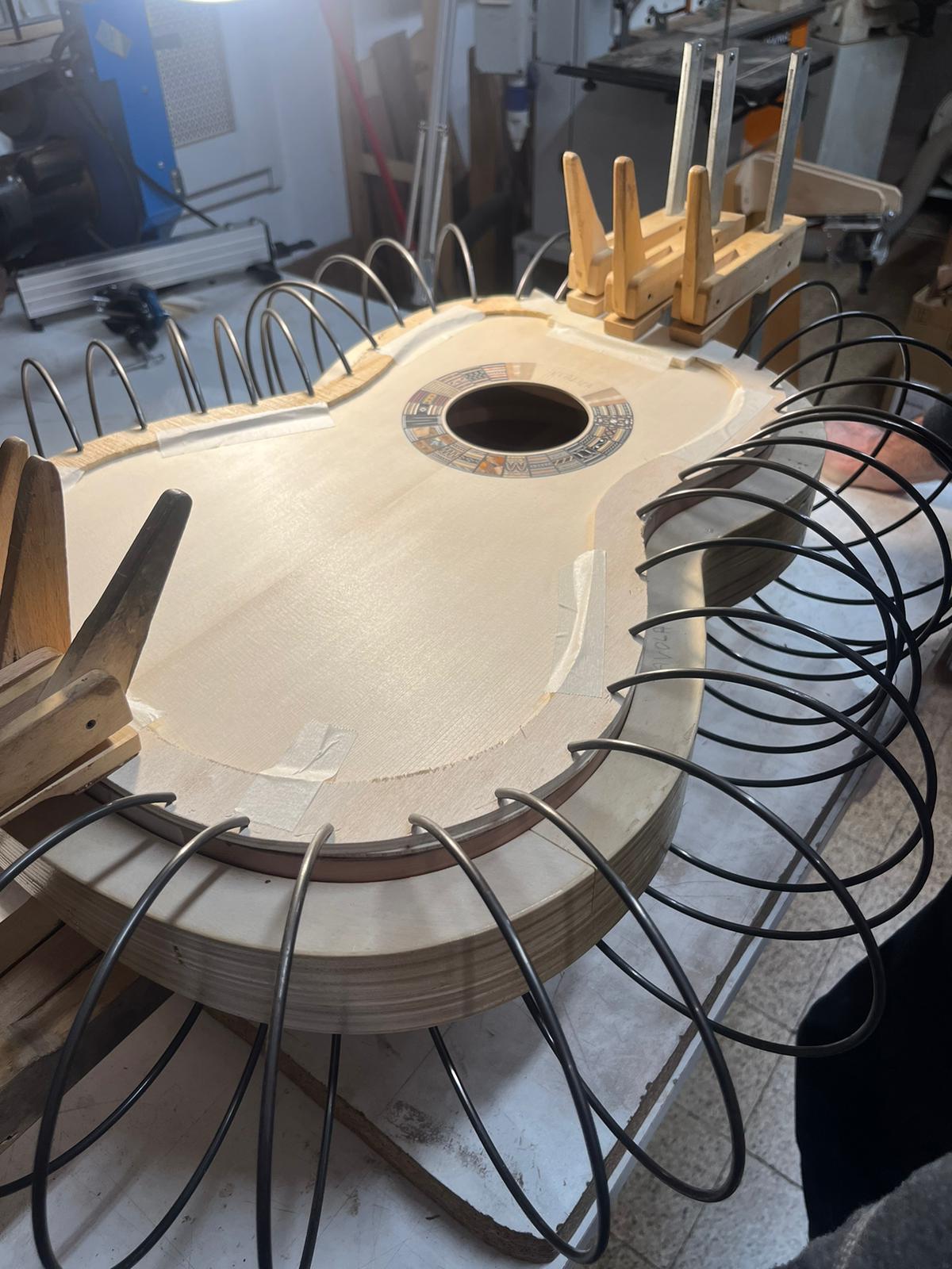 La tavola armonica, donata da Mario Grimaldi, è una bellissima tavola di abete della Val di Fiemme, leggera e risonante. L’abete per i raggi e le catene proveniva direttamente dal laboratorio di Pietro Gallinotti a Solero e risaliva agli anni Sessanta: è lo stesso legno che Gallinotti utilizzava per i propri strumenti.