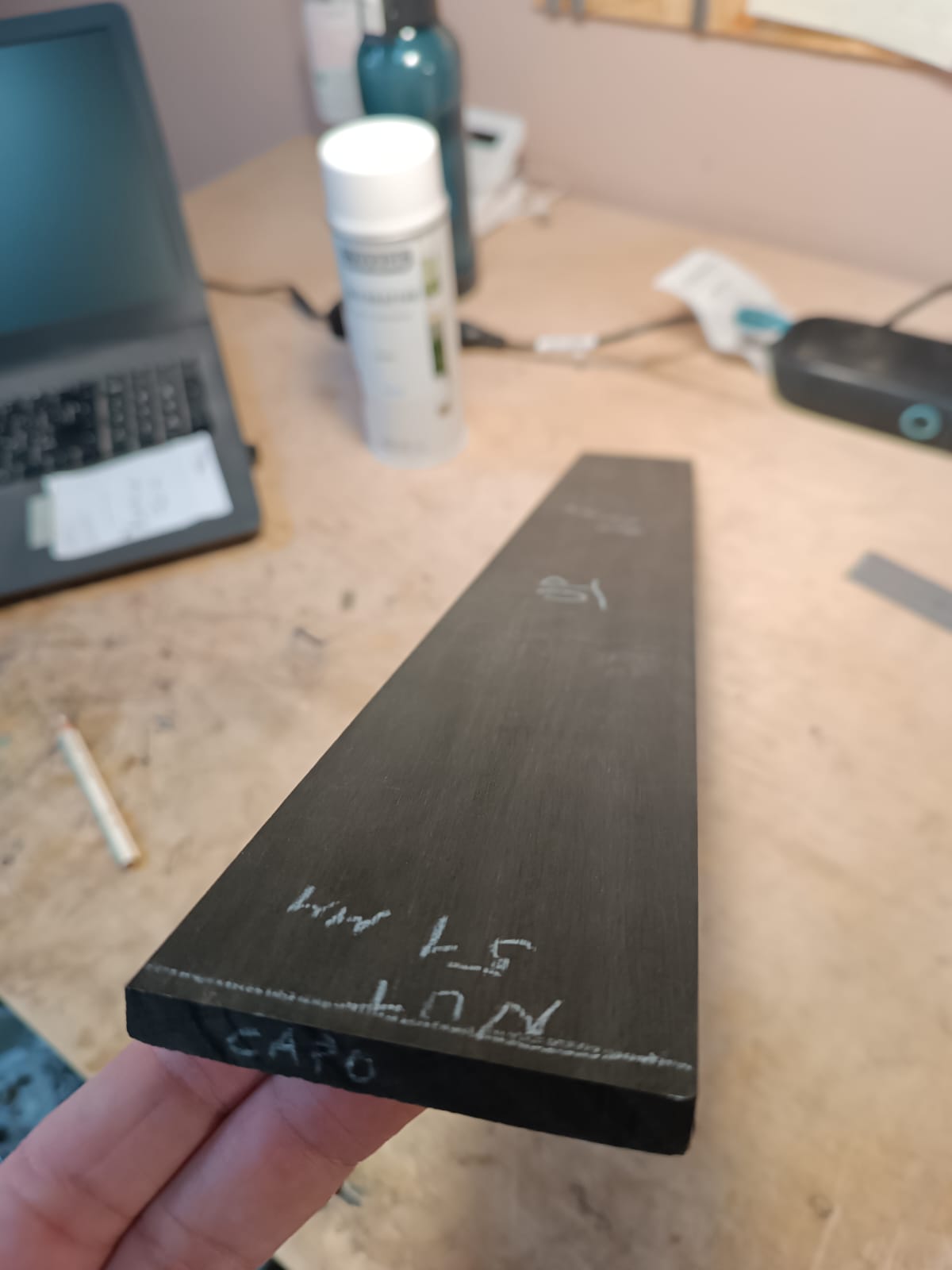 Si poneva poi il problema della tastiera e del ponticello, parti per le quali si impiegano solitamente legni esotici come ebano e palissandro. Per la tastiera è stato scelto un pino (Pinus Radiata) torrefatto e sottoposto a un processo di compressione per aumentarne la densità.
