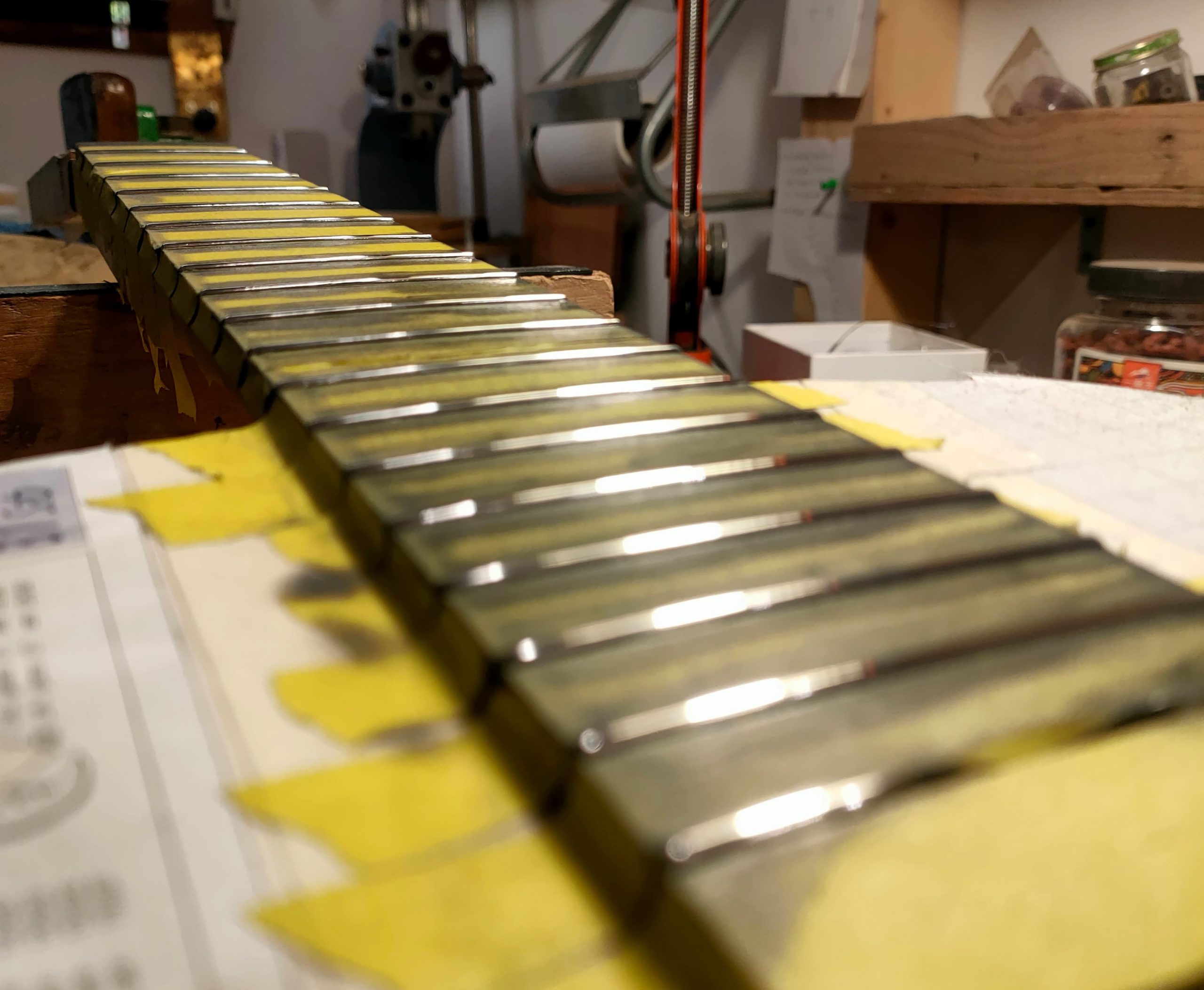 La chitarra torna a Mario Grimaldi per l’incollaggio del ponticello, il montaggio delle meccaniche e la messa a punto finale dei due ossi, al capotasto e al ponticello, dopo aver messo le corde.