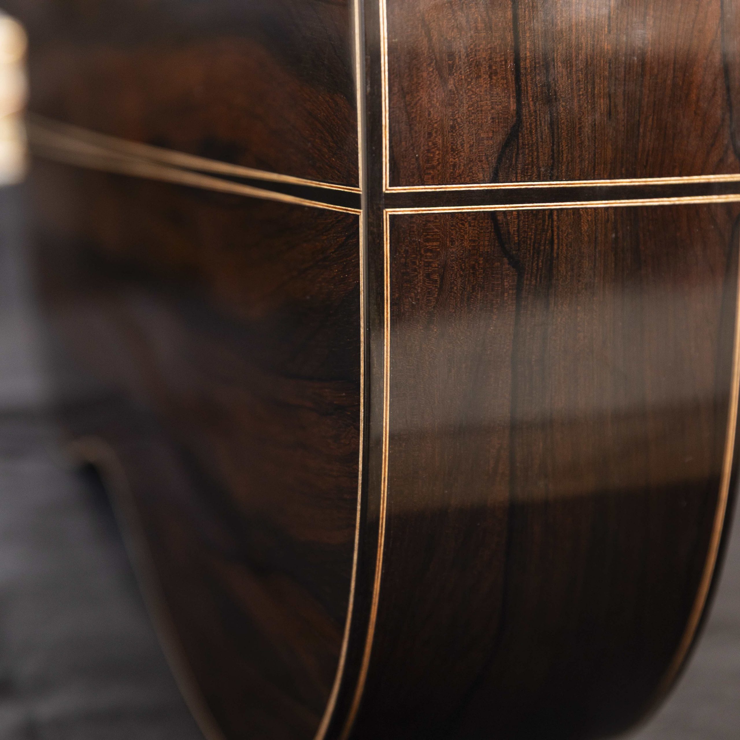 Costruisco indifferentemente chitarre in abete o in cedro, lavorando ogni essenza in modo diverso per esaltarne al massimo tutte le caratteristiche peculiari e scelgo solo sets speciali fra i più belli e con caratteristiche fisiche e acustiche superiori. Generalmente, per fondo e fasce uso Palissandro Indiano, un essenza che permette ancora di trovare materiale bellissimo e stagionato naturalmente, Palissandro Madagascar, bellissimo e sonoro, e Palissandro Rio, che, rilevazioni alla mano, si dimostra davvero il re dei legni per chitarra, rigorosamente accompagnato da certificato CITES.