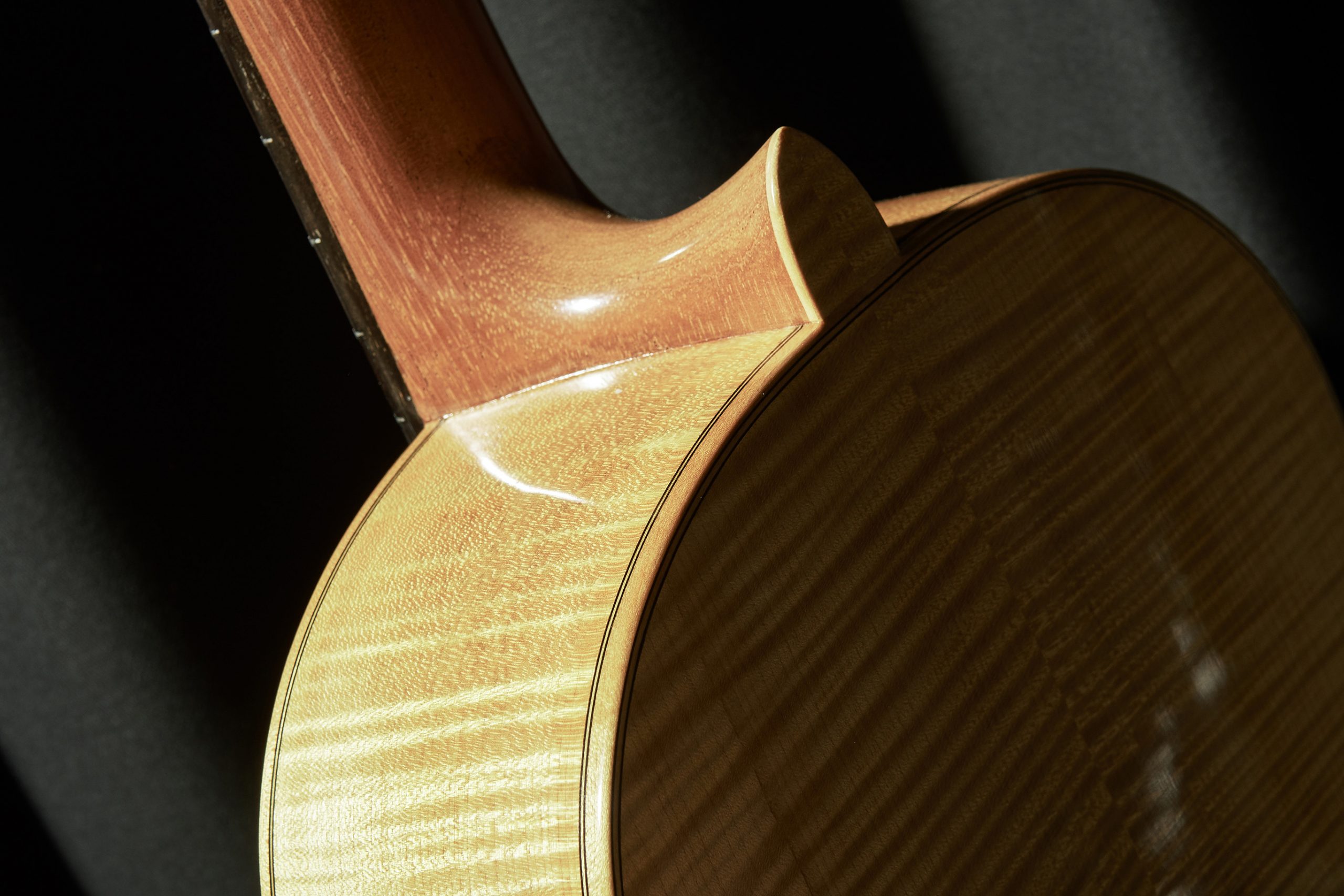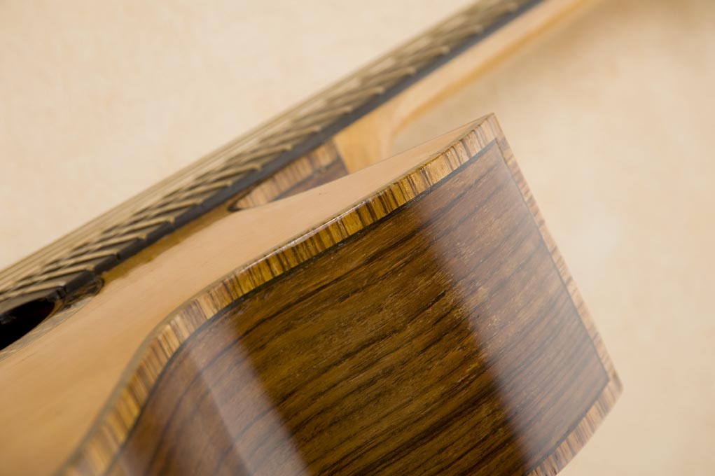 Assieme a questo ho voluto dedicare particolare cura alla scelta dei legni – in questo caso abete Val di Fiemme per la tavola armonica e bokote per fasce e fondo – e ad elementi e dettagli estetici per valorizzare ancora di più il mio stile che, come dicevo, rimane tecnicamente legato alla tradizione ma che ho sviluppato cercando di riversarvi in chiave più moderna le mie idee e il mio gusto personale.
