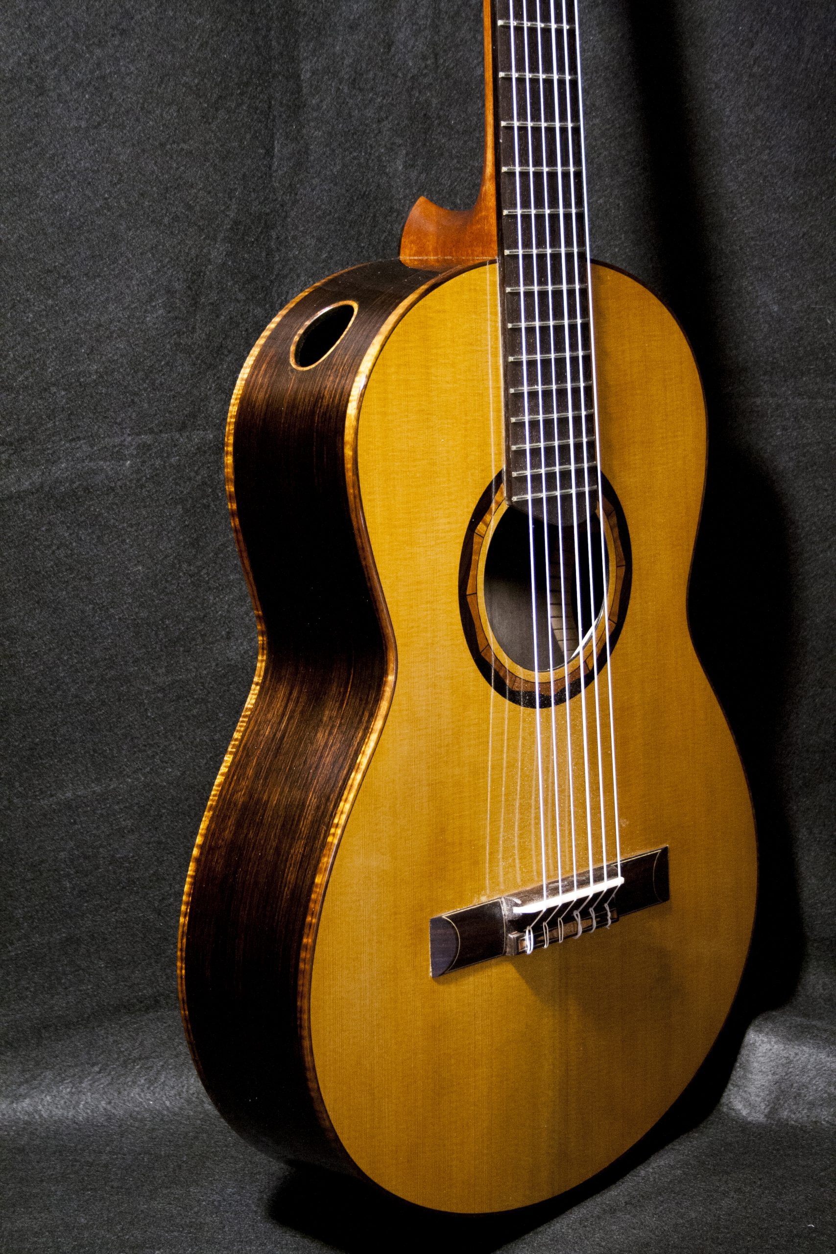 Porterò uno dei miei strumenti: la chitarra classica “Sei Corde Nylon”, pensata per un suono tradizionale ma con un timbro brillante e potente. Ho adattato il mio sistema di X-bracing a una cassa dalla forma meno convenzionale, con lobi inferiori più snelli e arrotondati; diapason 642 mm, tavola con leggera bombatura, tastiera radius 20′ e 51,5 mm al capotasto.