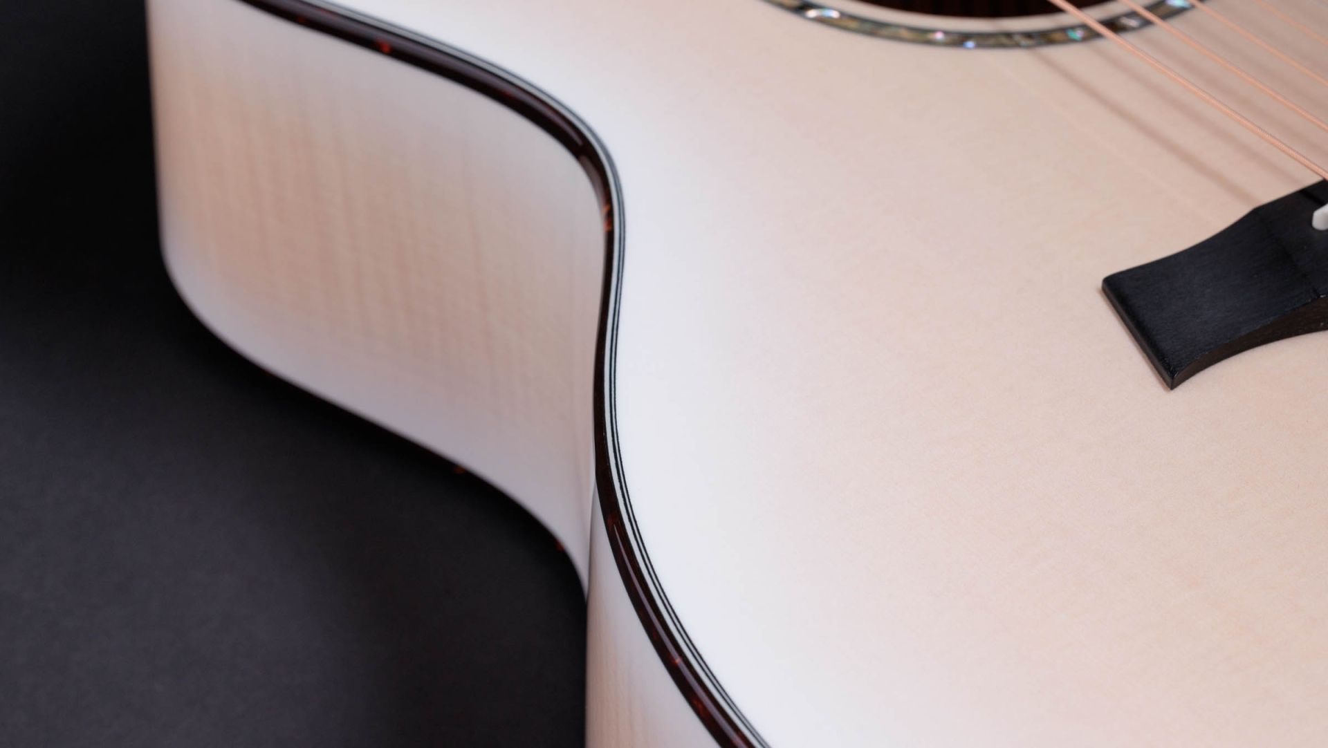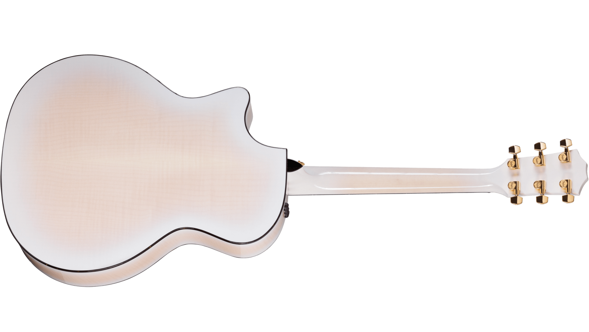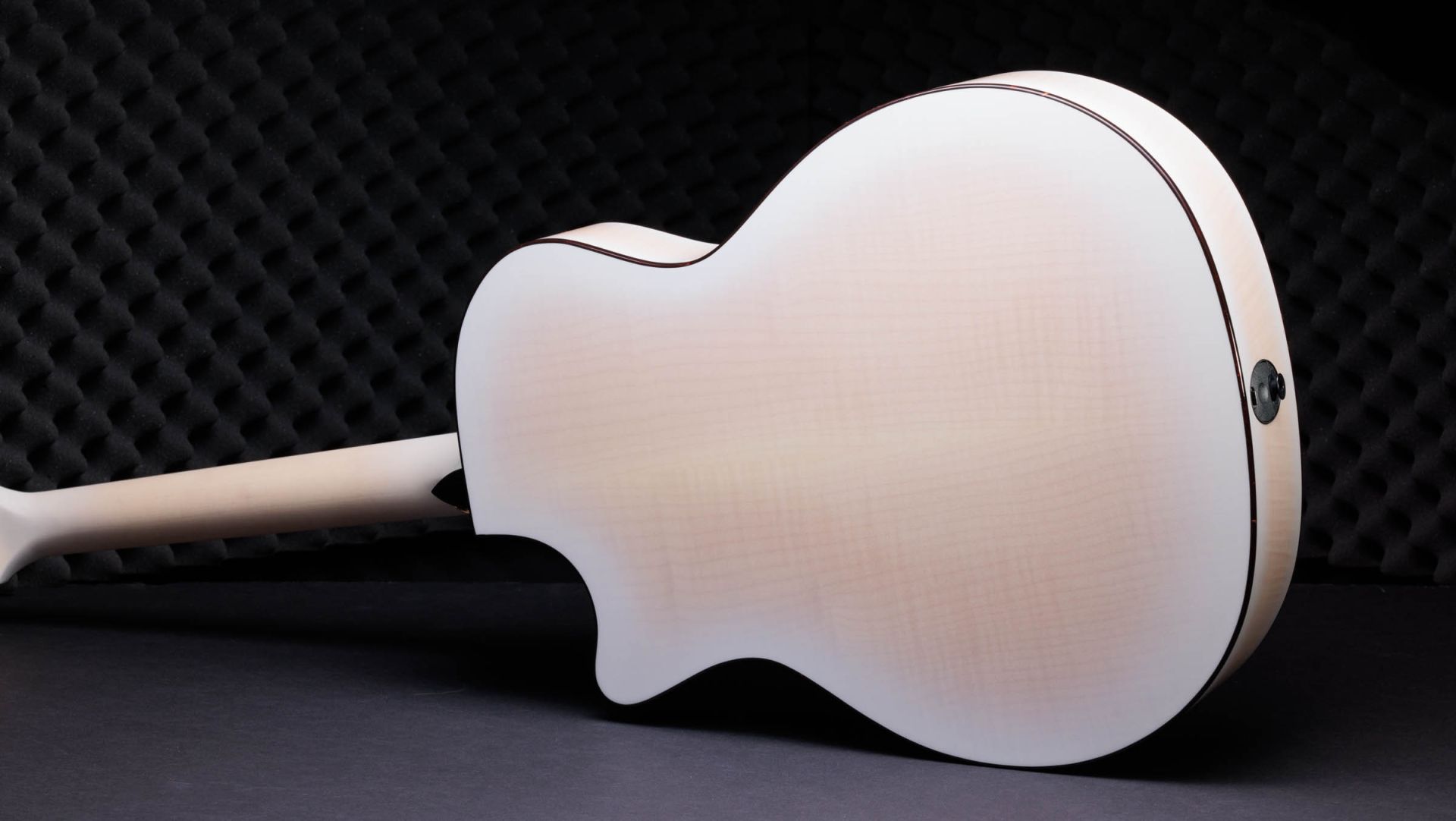 La 614ce LTD, gode di una particolarissima finitura trasparente bianca lucida, che si unisce a dettagli raffinati come il binding tortoise e gli intarsi in abalone verde della rosetta e dei segnatasti.