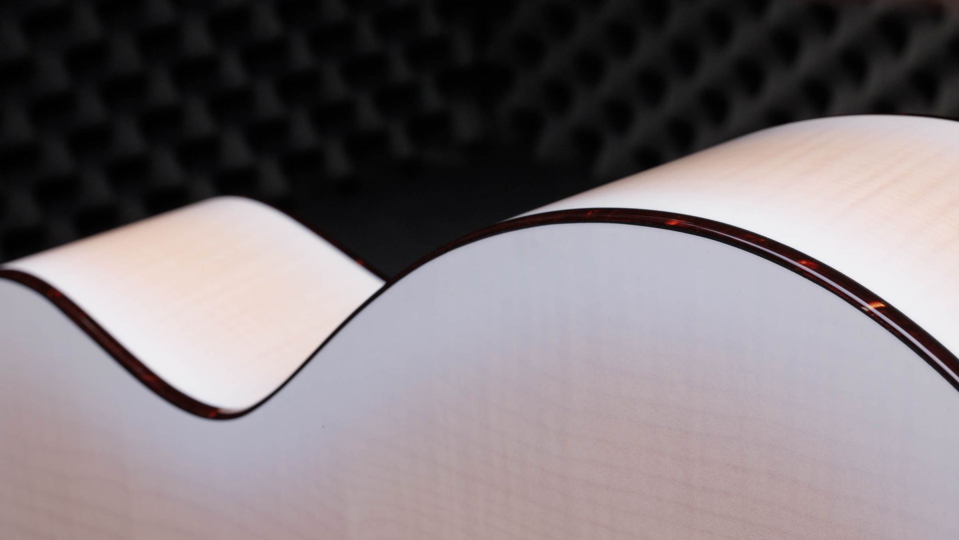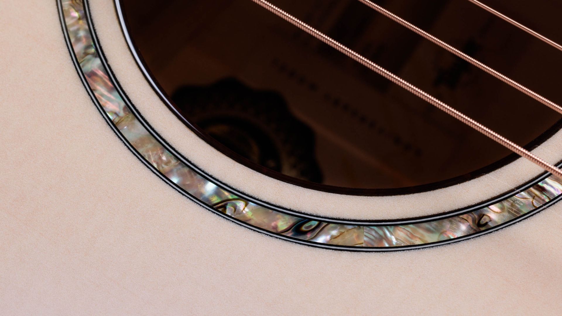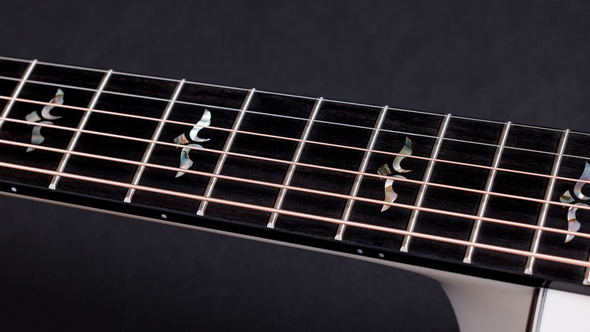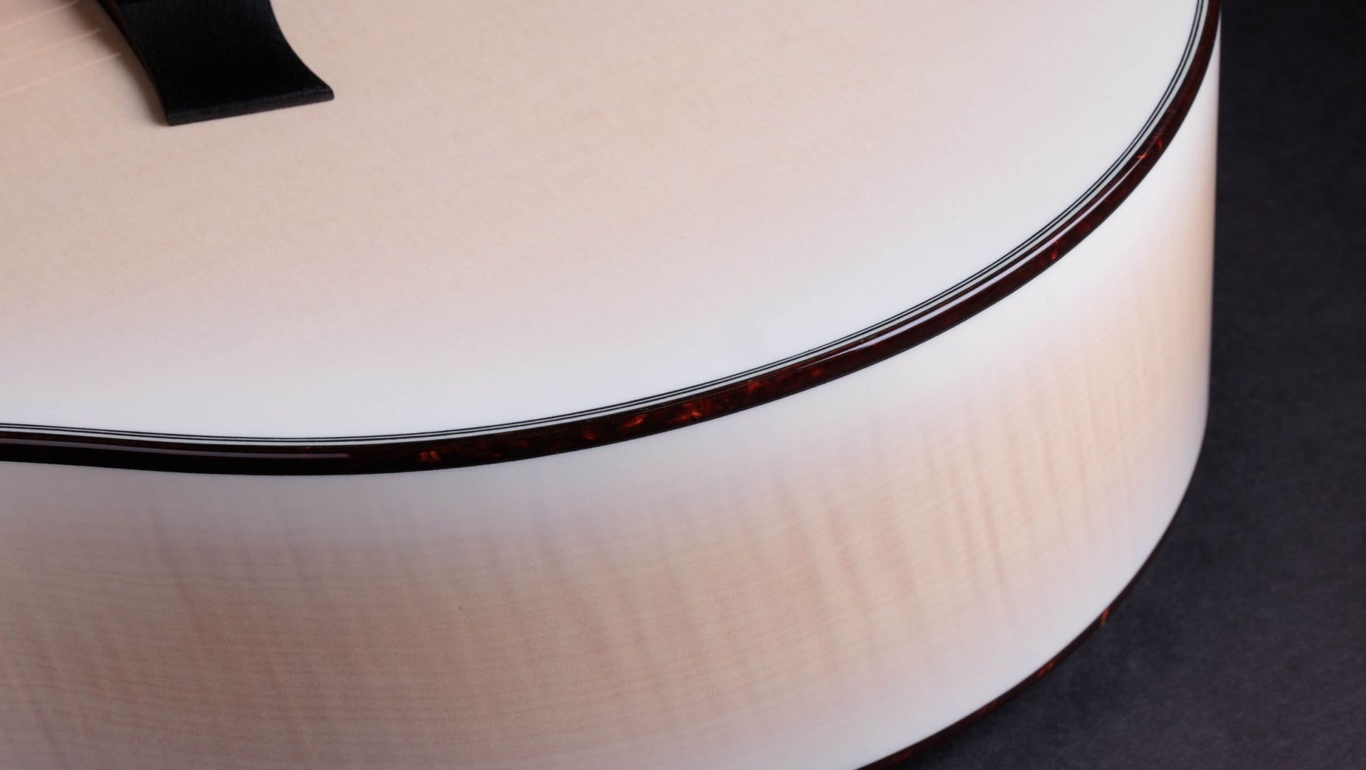 La 614ce LTD, gode di una particolarissima finitura trasparente bianca lucida, che si unisce a dettagli raffinati come il binding tortoise e gli intarsi in abalone verde della rosetta e dei segnatasti.