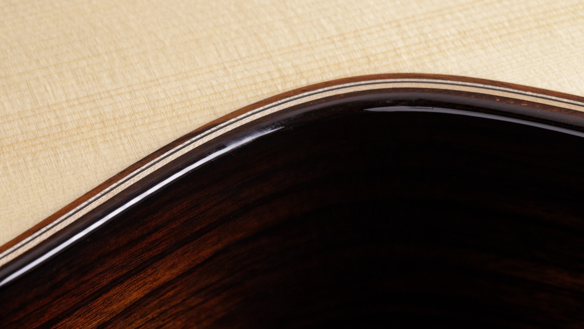 I dettagli di lavorazione che migliorano il comfort distinguono la Builder’s Edition 814ce dal modello standard. Un cutaway sagomato in modo impeccabile garantisce un facile accesso alle note alte, mentre un poggiabraccio smussato in mogano offre una superficie liscia per l’appoggio del musicista.