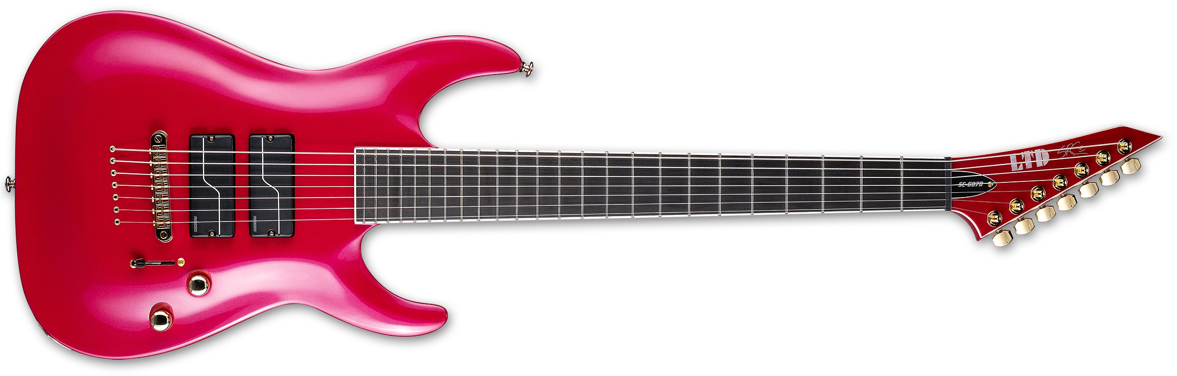 La LTD SC-607 Baritone di Stephen Carpenter (Deftones) si aggiorna con la nuova finitura Magenta e hardware dorato, ma resta una 7 corde baritona pronta a gestire muri di suono. Costruzione neck‑thru‑body, scala 27″, corpo in mogano, manico in acero a 3 pezzi, tastiera in Macassar ebony raggio 400 mm con 24 tasti extra‑jumbo e paletta reverse.