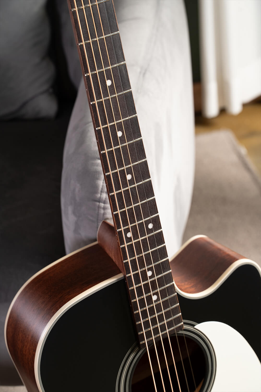 La tastiera e il ponte sono realizzati in ovangkol, un legno resistente e di buona qualità. La scala di 25,5” con 20 tasti offre una suonabilità confortevole.