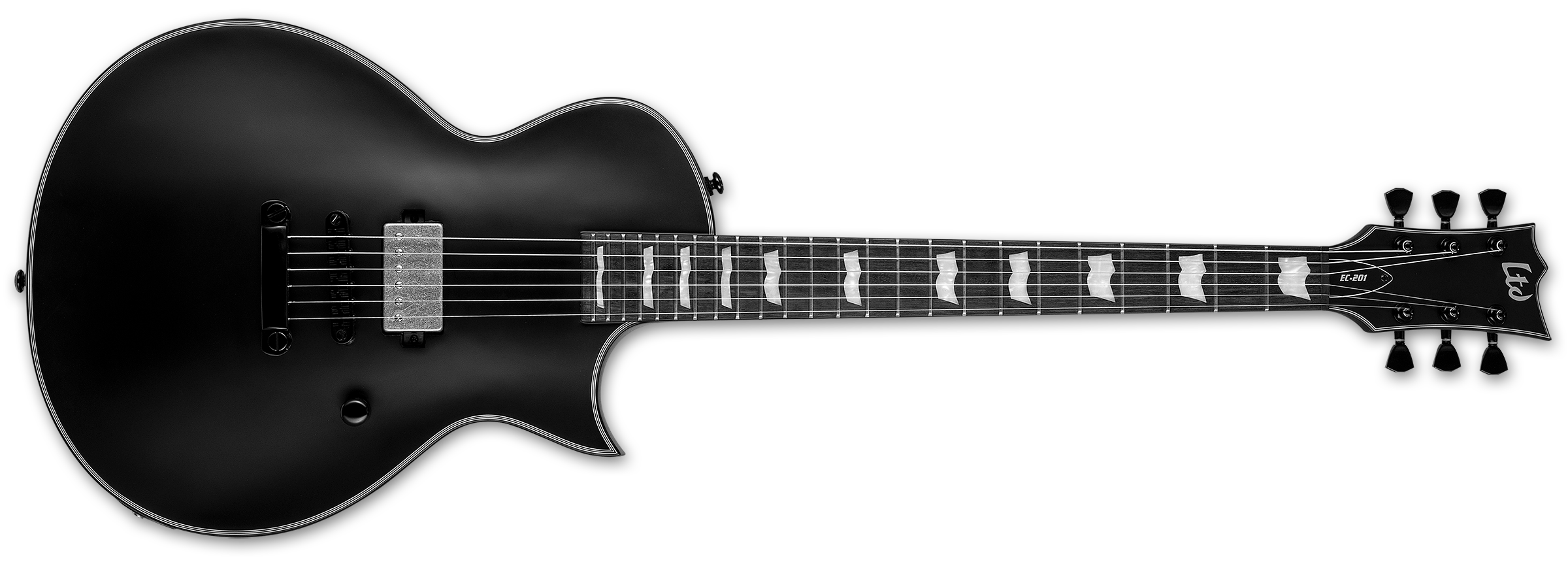 La LTD EC-201 si distingue anche per i suoi 24 tasti extra-jumbo e gli inlays a bandiera ESP, oltre a un hardware completamente nero.