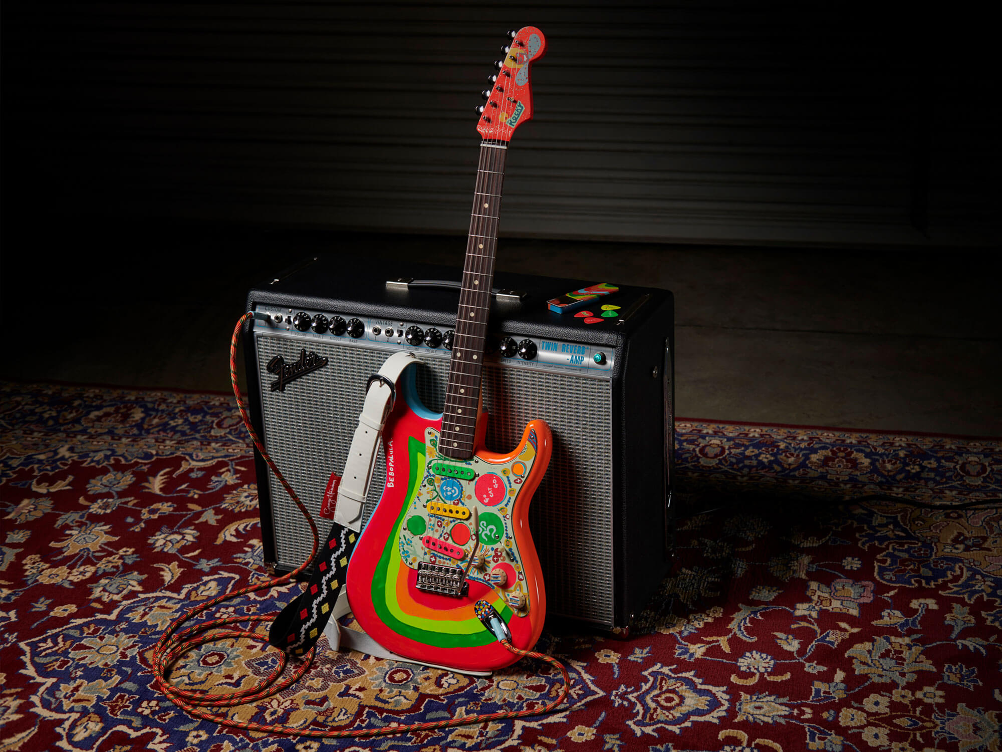 La Rocky Stratocaster ha un corpo in ontano dipinto a mano con la replica delle famose pennellate psichedeliche di Harrison.