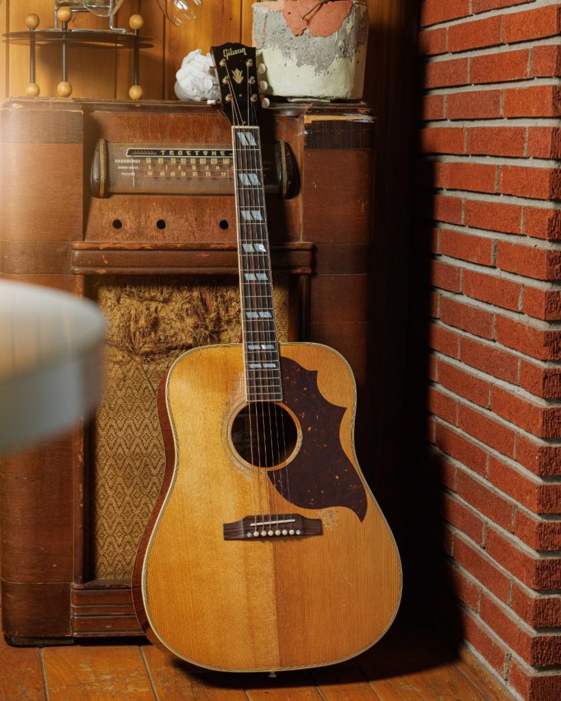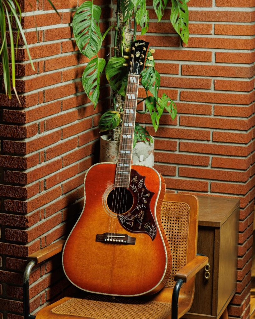Primo modello Gibson con spalle squadrate, la Hummingbird del 1960 è diventata rapidamente un’icona grazie al suo design unico e ai motivi decorativi sul battipenna.