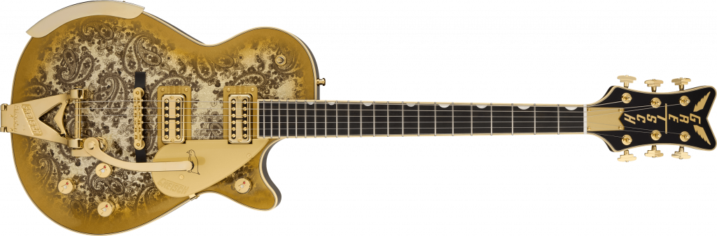 La G6134TG Paisley Penguin si presenta con una finitura gold edge burst su un top in paisley dorato e sparkle, un’estetica che richiama il gusto decorativo di altre epoche, in linea con la tradizione Gretsch più teatrale.
