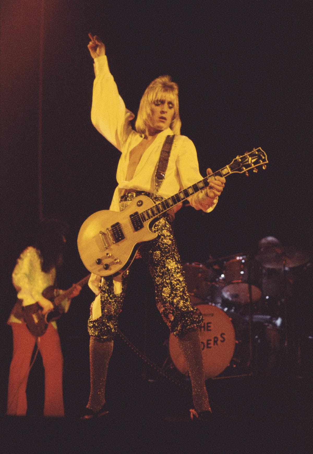 Al centro del suono di Ronson c’era la sua 1968 Les Paul Custom, che lui stesso aveva privato della finitura Ebony originale, lasciandola “grezza” in un gesto tanto spontaneo quanto destinato a diventare iconico. Abbinata a wah wah pedal, fuzz ed echo, quella chitarra sviluppava un timbro aggressivo, melodico, inconfondibile, la firma sonora del glam rock.