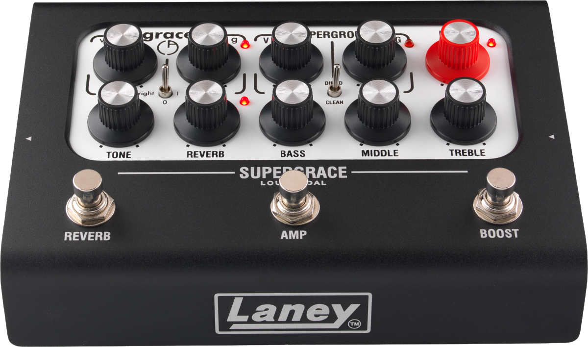 Sul fronte digitale, il Supergrace integra la tecnologia LA·IR (Laney Advanced Impulse Response), precaricata con gli IR preferiti da Billy Corgan. Il sistema permette di memorizzare due IR sul dispositivo, ciascuno con EQ parametrico indipendente, e può essere disattivato per ottenere un segnale DI senza emulazione cabinet. Il riverbero digitale di alta qualità deriva dall’acclamato pedale Secret-Path ed è controllabile via footswitch o MIDI.