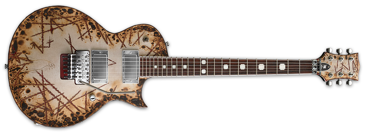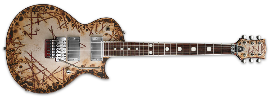 Prende la forma della Eclipse single-cutaway nell’appena citata finitura distressed con segni di bruciature e scanalature sul body e sulla paletta.