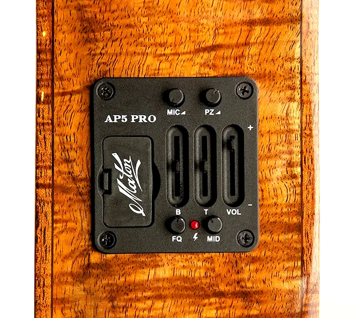 Il sistema di amplificazione è il collaudatissimo AP5 PRO, sistema che combina un microfono interno e un piezoelettrico posizionato sotto il ponte, offrendo al musicista un controllo completo sul tono e sul bilanciamento grazie a un preamplificatore dotato di equalizzatore a cinque bande.