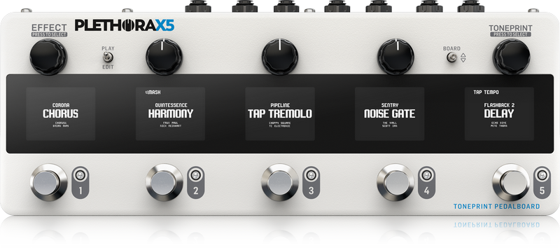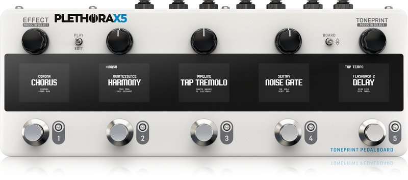 Ogni pedale nel Plethora X5 ha 75 slot Toneprint disponibili per un rapido richiamo delle impostazioni preferite, che consente di gestire e memorizzare un set di suoni preferito; con la funzione Quick Swap si può gestire il routing dei pedali attraverso la pressione dei footswitch per invertire l’ordine dei pedali.