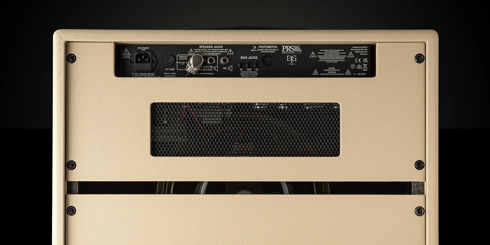 Sul retro si trovano le uscite speaker (2×4 Ω, 2×8 Ω, 1×16 Ω), un ingresso per footswitch a 5 pin che controlla boost, reverb e tremolo, oltre al monitoraggio bias e alla presa di alimentazione IEC con fusibile accessibile.