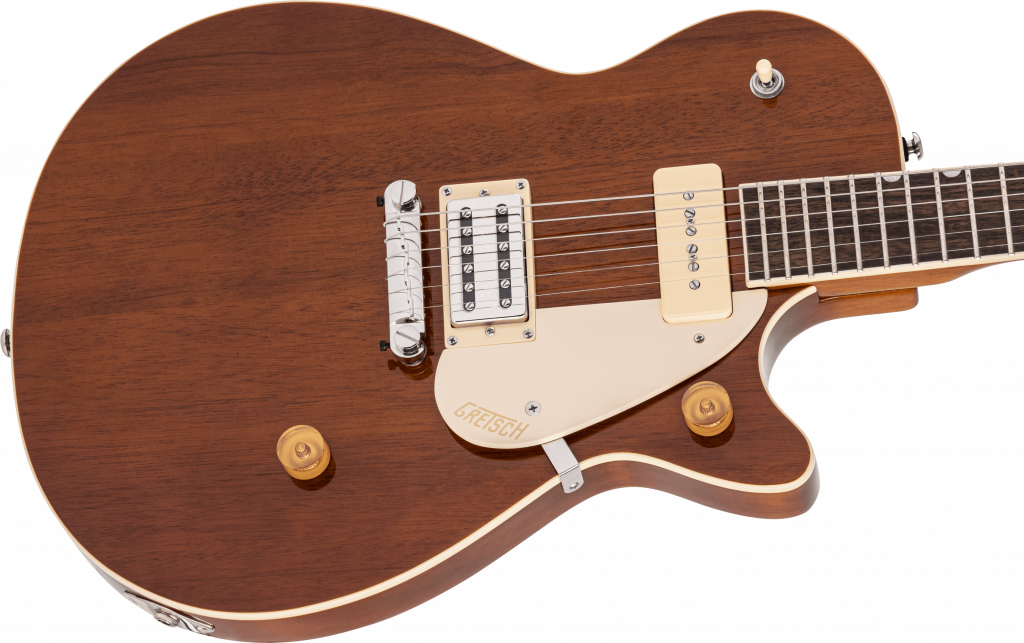 I magneti sono controllati dalla classica circuitazione Gretsch anche se qui in formato ridotto: selettore a 3 posizioni e solo un master volume e un master tone.