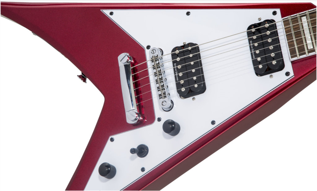 Il ponte è fisso TOM-Style con il suo tipico tailpiece, una scelta tradizionale e più che collaudata. Le meccaniche sono 6 in linea sulla classica paletta appuntita Jackson. Tutto l’hardware è in finitura nickel.