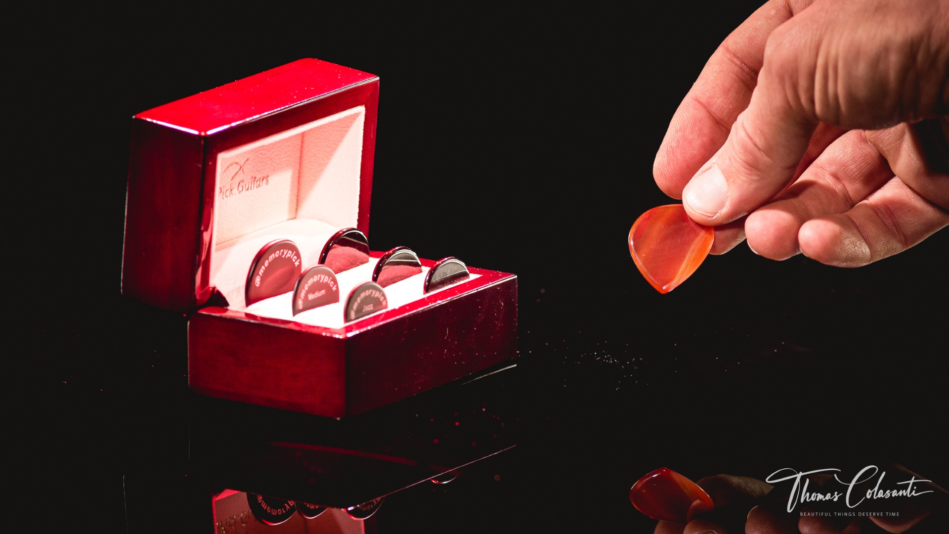 Acquistati più per bellezza che per funzionalità, quei plettri rimasero inutilizzati per anni, fino a quando, nel 2004, li riscoprì suonando con la sua band. La sorpresa fu immensa: il plettro in agata trasformò il suo modo di suonare, offrendo una velocità e una precisione straordinarie.