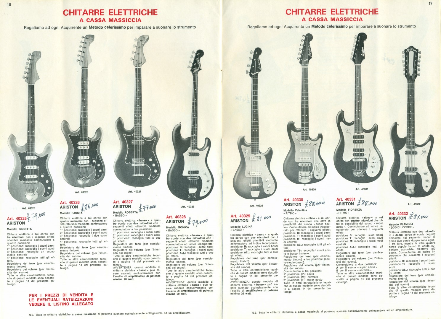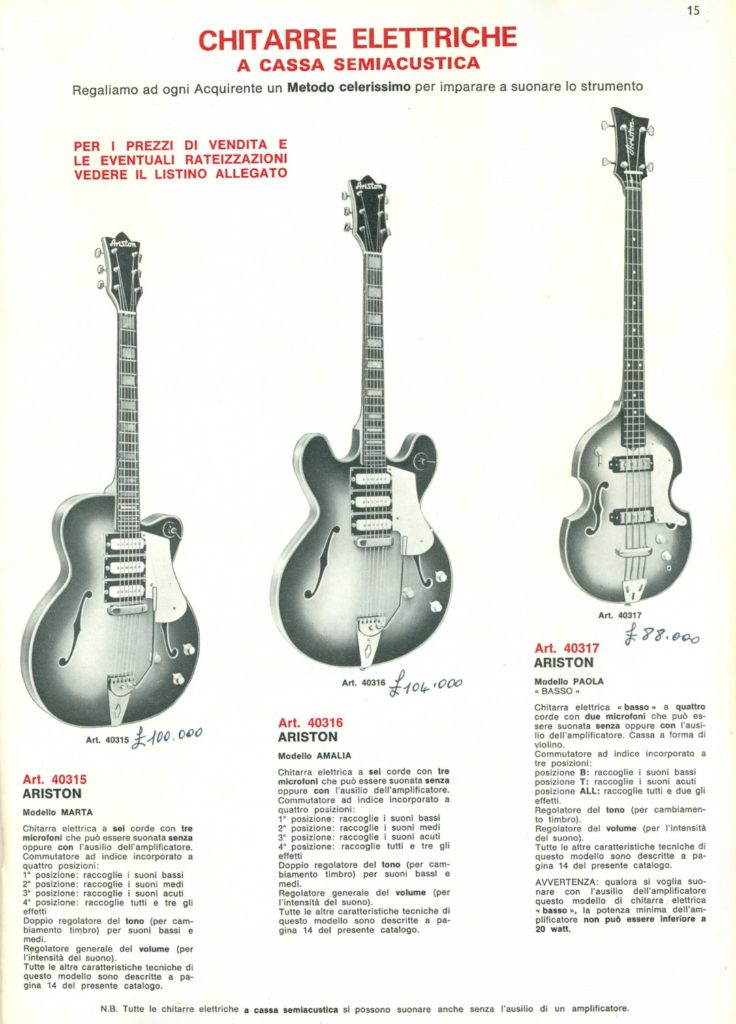 L’altro, Amalia, era la tipica copia della Gibson 335. Su entrambi i modelli venivano montati pickup più economici di quelli che troviamo sulle Welson e veniva modificata la forma della paletta.