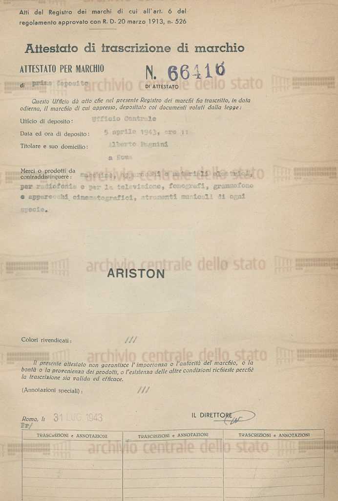 Molti articoli erano avevano il marchio Ariston registrato nel 1943 e destinato a televisori, radio, fonografi e strumenti musicali di ogni specie.