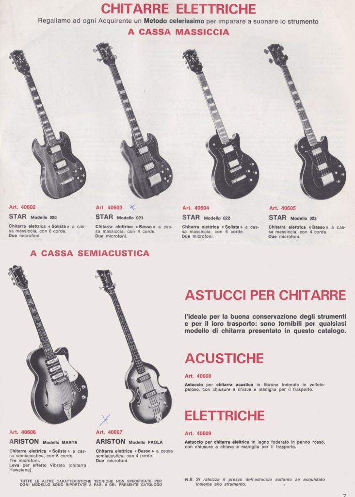 Il catalogo Bagnini ha un curioso sistema di denominazione dei modelli che oggi fa impazzire i collezionisti. Ogni variante, anche il semplice numero di pickup, prende un nome di donna diverso. Paola, Marta, Valentina, Lucina, Fiorenza, Roberta, Cristibna, Aurelia, Amalia, Albiana, Emilia, Lora, Raffaella, Alessia, Diana, Giuditta, Fausta, Monica… un incubo!