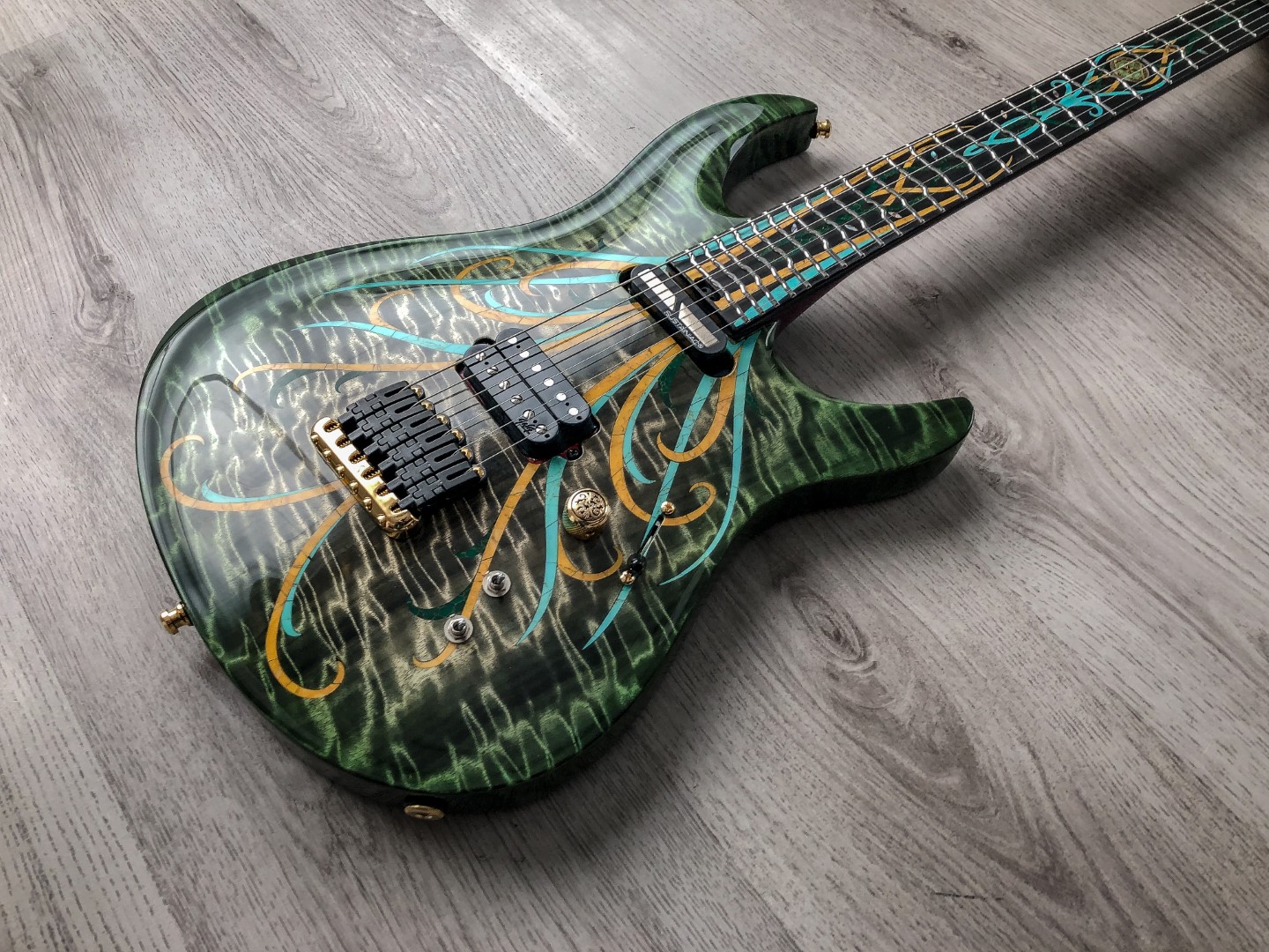 La Shen nasce come full custom side-project, dove le richieste del particolare cliente andavano persino oltre a quanto avessi prima immaginato: 10 corde (un A cantino e tre da basso, B, G#, C#), multiscale, suonabile in tre diverse posizioni posturali, fretless area, parzialmente scallop, direct output, killswitch etc etc.