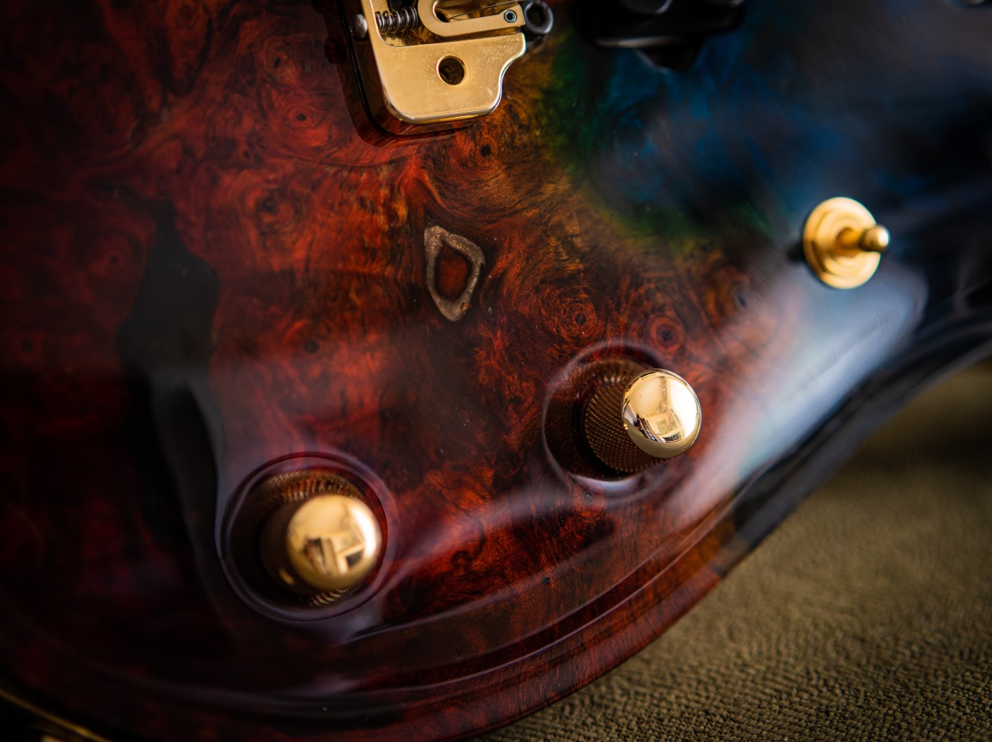 La lavorazione del top rende effettivamente l’idea delle ore di lavoro spese sullo strumento, come anche l’incasso dei potenziometri che non è dritto ma è smussato, e ancora i due cut del body, lavorazioni che trovi solo in alta fascia, a prescindere dal brand.