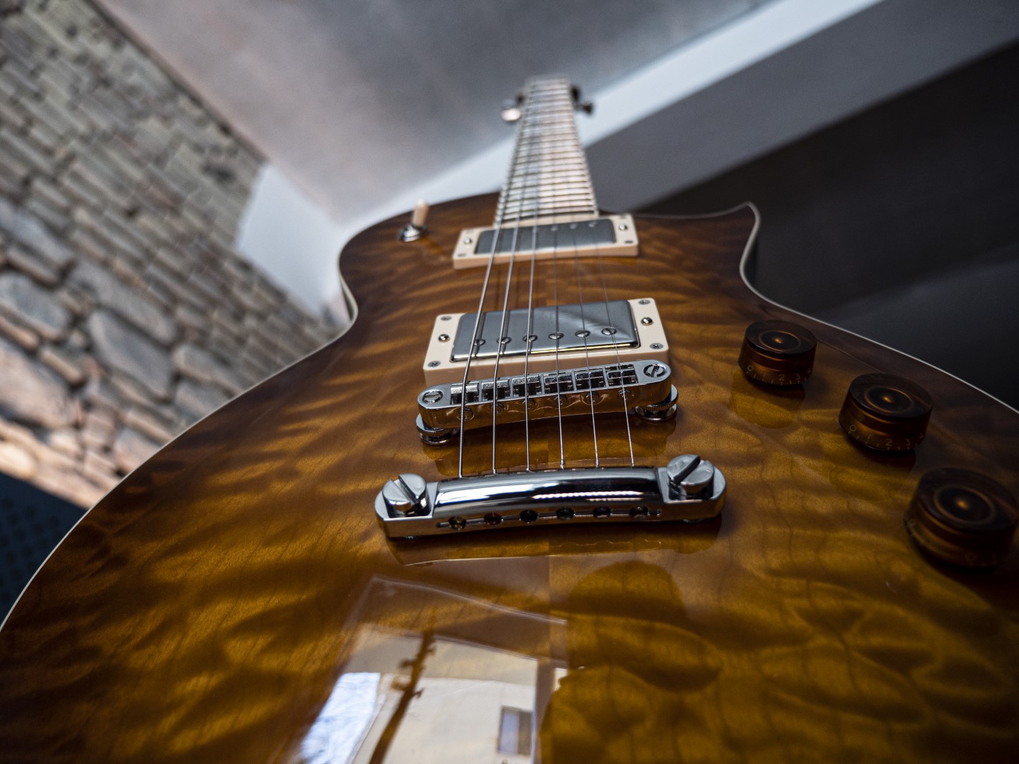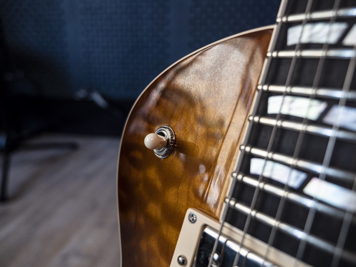 La USA Eclipse ha un corpo in mogano con camere tonali per alleggerirne il peso, sormontato in questo caso da un top in acero quilted (è disponibile anche il top fiammato) e una caldissima finitura Tea Sunburst, una delle varie opzionali (sia lucide che satinate, semitrasparenti o a tinta unita).