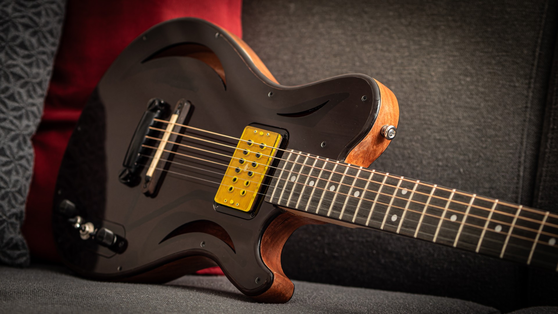 Parliamo di una chitarra con corpo in leggero mogano Oukumé, dotato di camere tonali e rivestito in plexiglass da 5mm, e un manico realizzato con la classica combinazione di acero canadese e tastiera in palissandro. Si tratta di un 22 tasti, profilo Slim C, con un radius di 16″ e tasti medium.