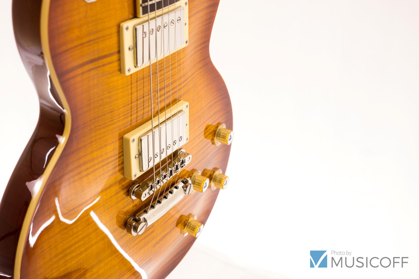 “La chitarra è giunta a noi per il test nella sua bella finitura iced tea burst (disponibile anche nera), con un accattivante carved top in acero fiammato. Il body in mogano è alleggerito con delle camere tonali che ne arricchiscono anche il suono. La scala del manico mogano/palissandro è 24 3/4″, con profilo a C.
