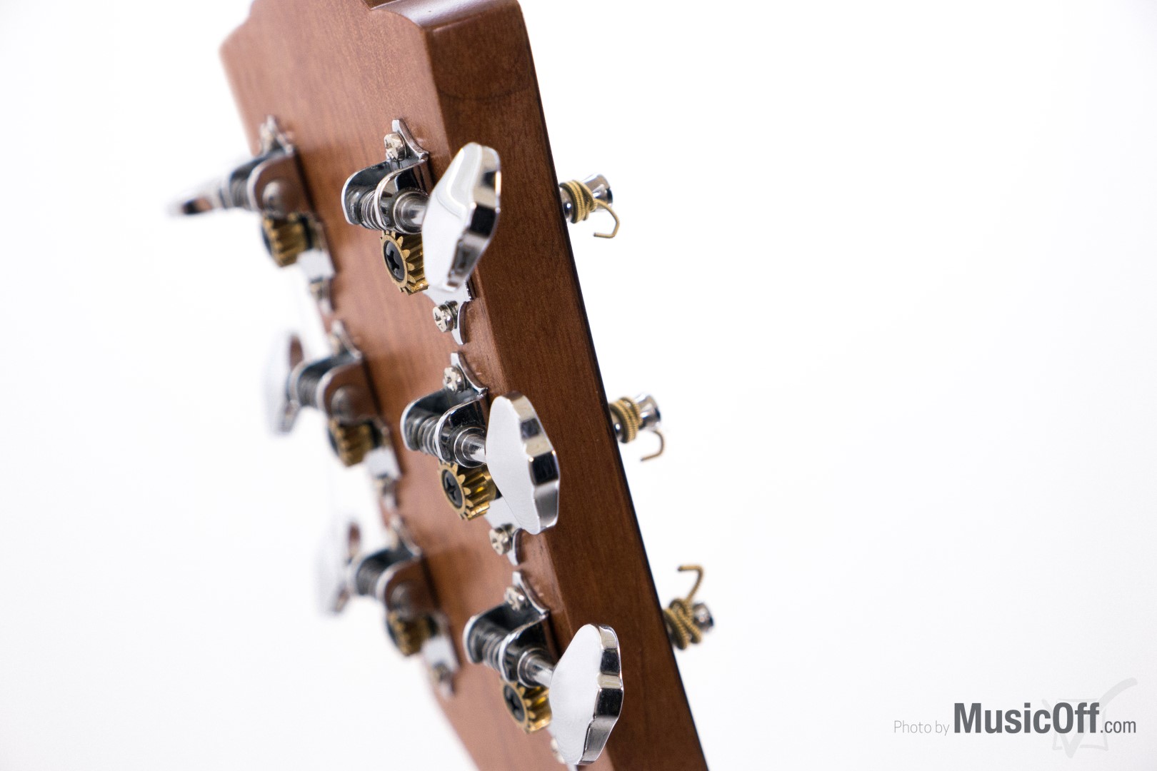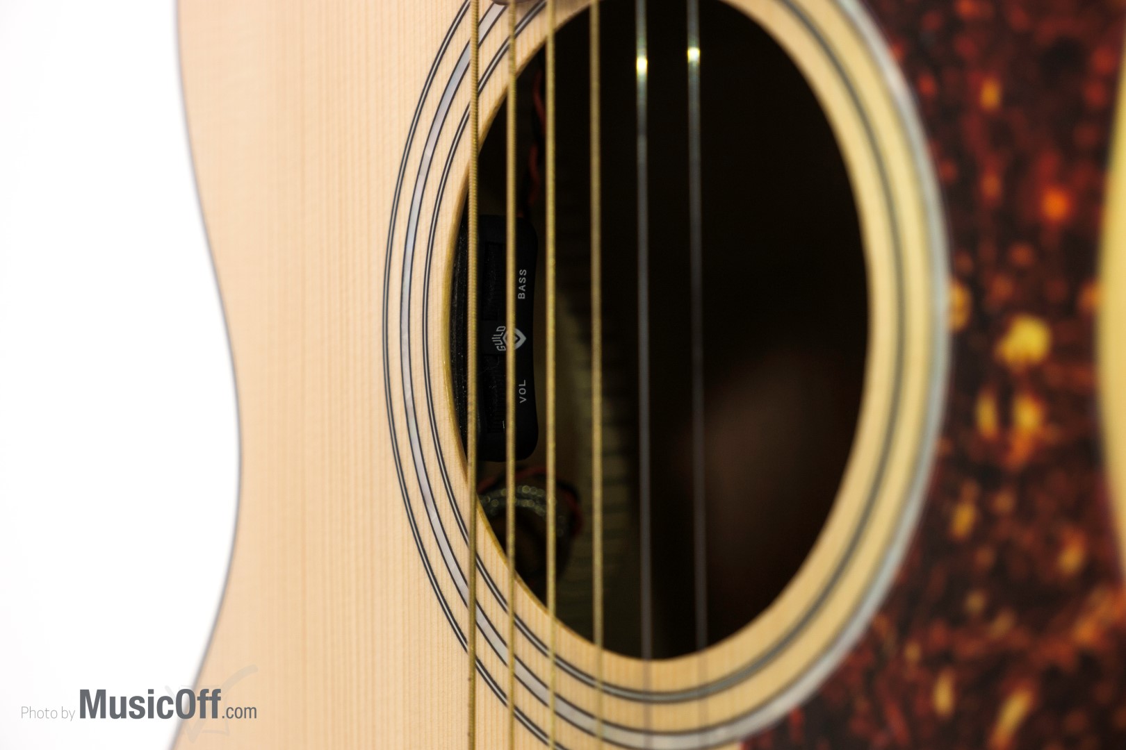 La chitarra è costruita con cassa in laminato di mogano e top in abete Sitka massello con misure tali da contenere il feedback senza rinunciare a una buona risposta sulla gamma intera delle frequenze grazie anche al fondo bombato.