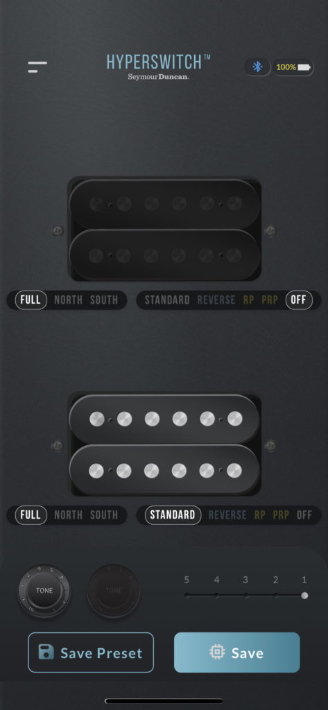 Molto semplicemente abbiamo la posizione che fa vedere quali sono i pick-up attivi e i controlli attivi (e le relative variazioni) in quel determinato posizionamento dello switch; è possibile con i tasti sottostanti salvare sia tutte le posizioni (save preset) che la posizione corrente (save).