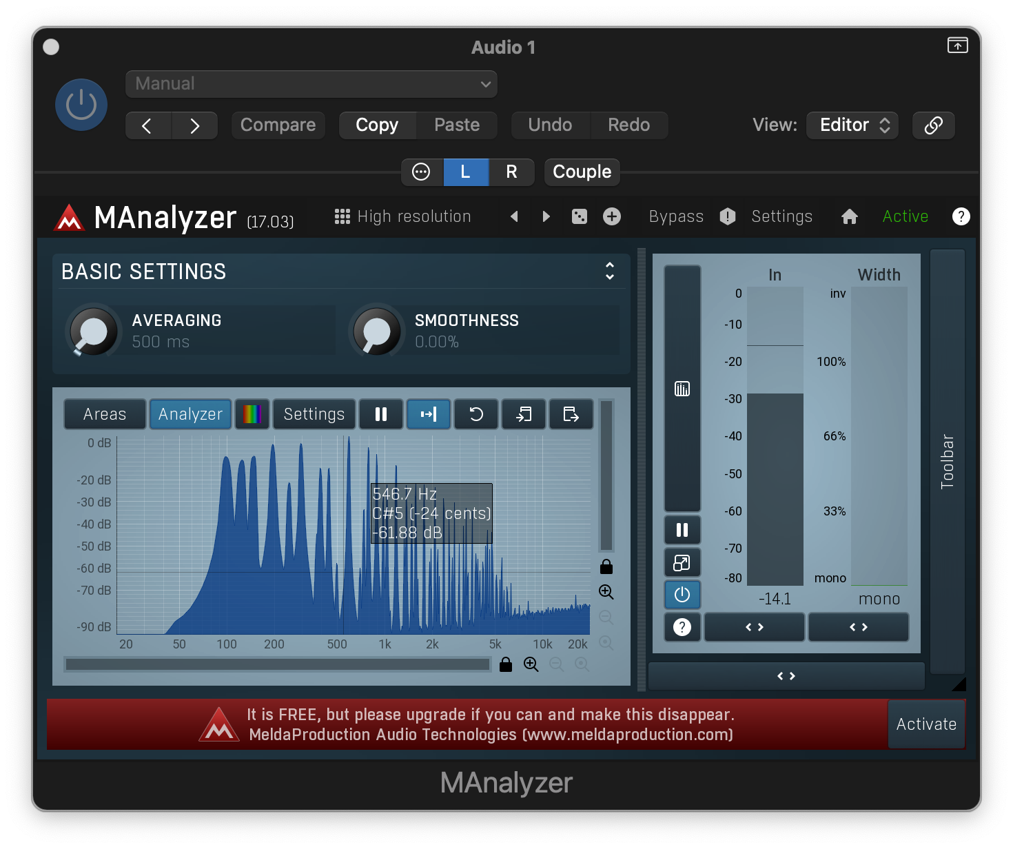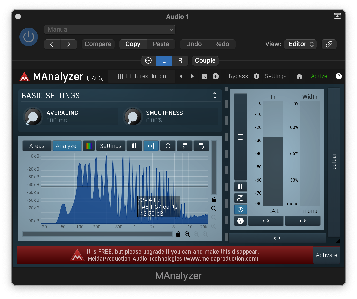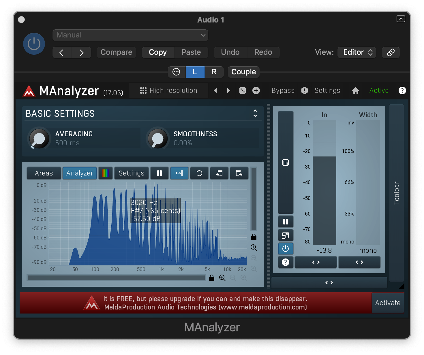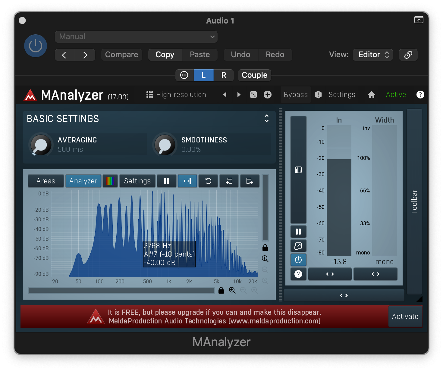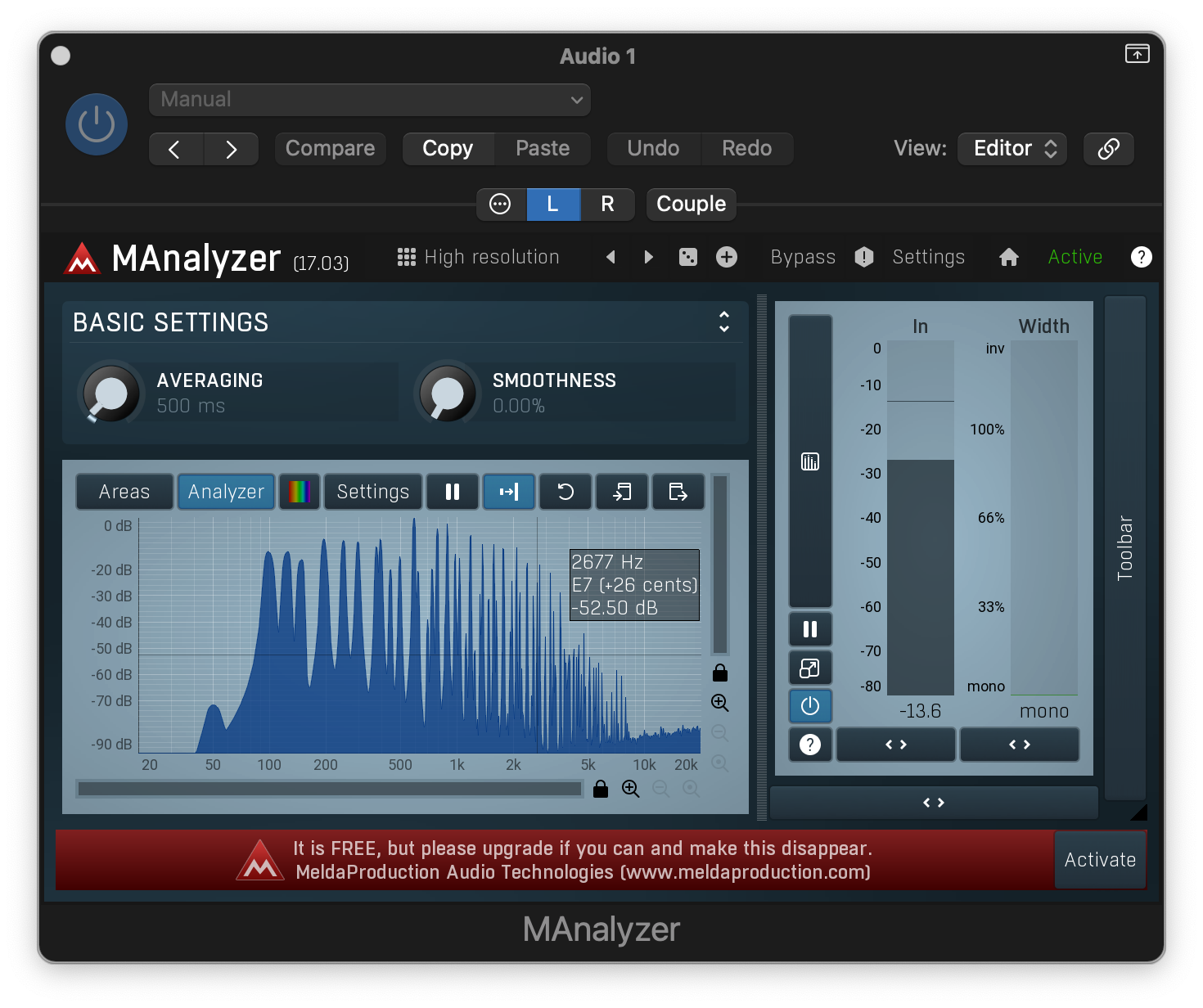 Il plugin utilizzato è lo spectrum analyzer della Melda Audio reperibile gratuitamente (così chiunque può ripetere la stessa catena) e i risultati sono i seguenti: