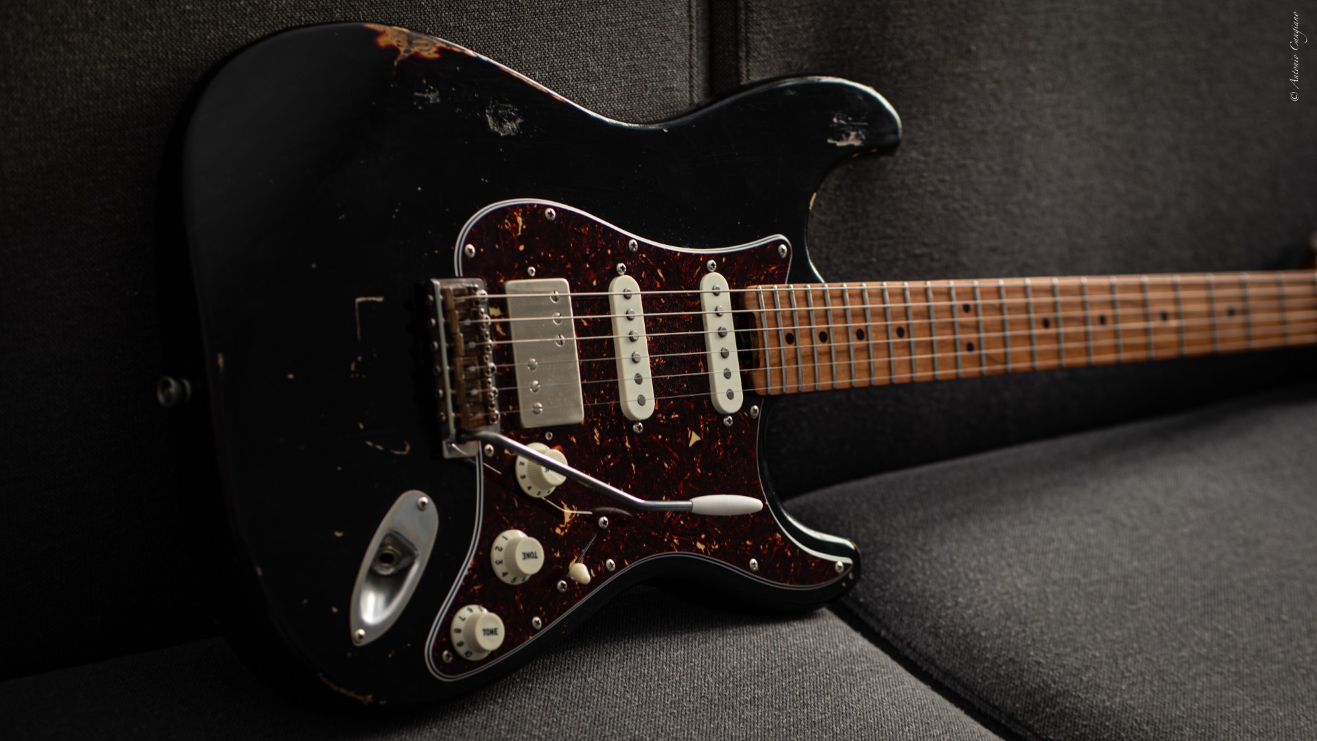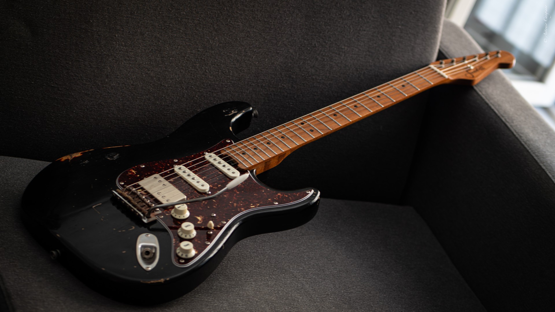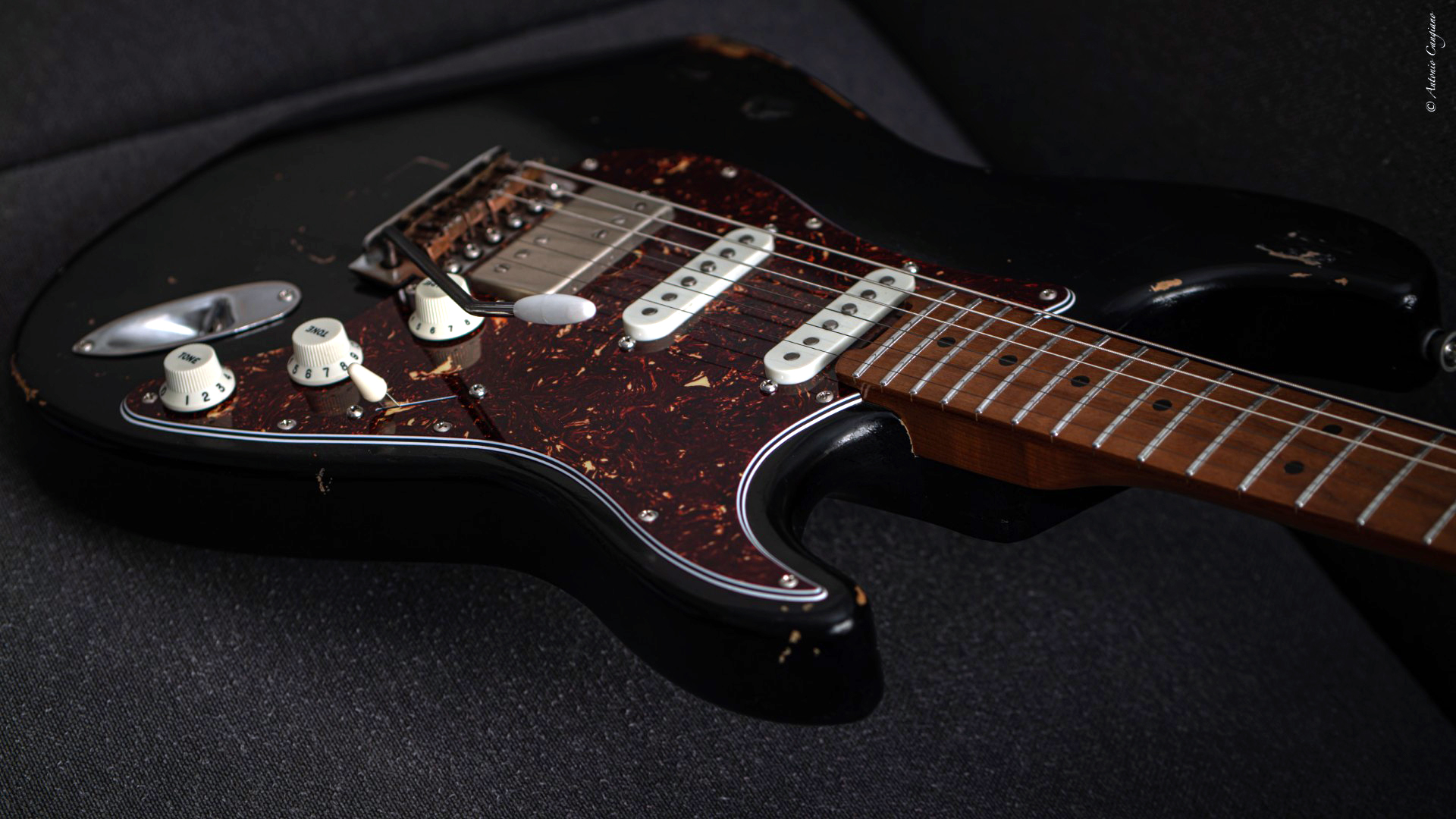 Nello specifico questo strumento è un custom shop con delle richieste specifiche e la forma è ovviamente quella stratoide ma con delle modifiche strutturali sia nel tummy cut che nelle stondature e nel suddetto accesso al manico, per avere una performance migliore e più comoda.